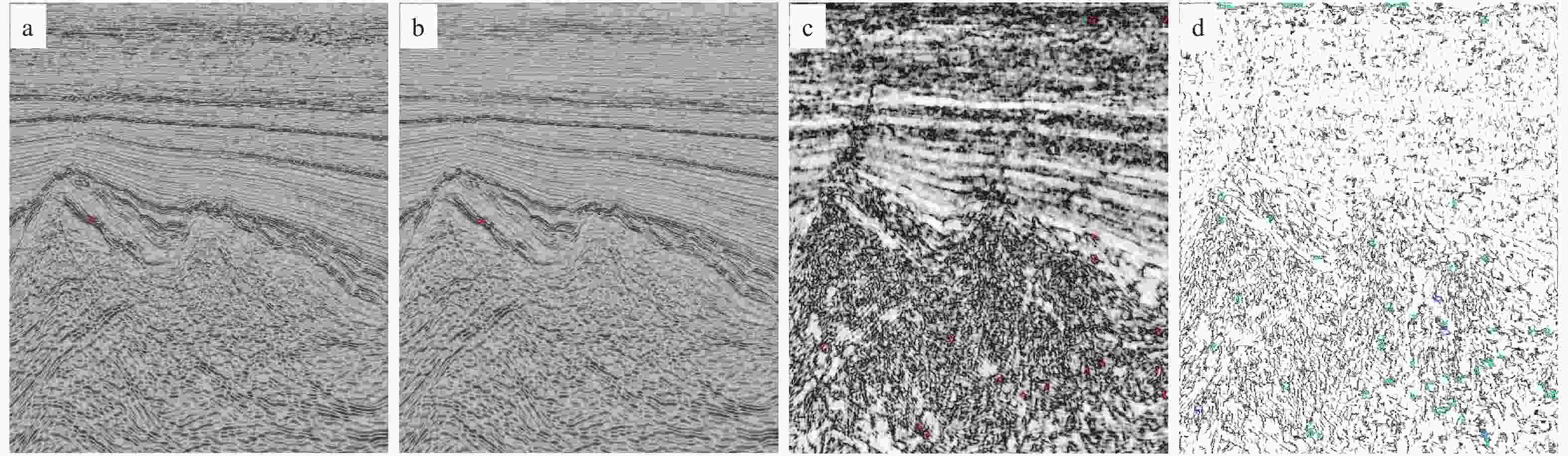 a—原始地震切片;b—经中值滤波算法进行去噪后的地震切片;c—经混沌体算法进行不连续性检测后的地震切片;d—经产状控制蚂蚁体算法识别后的裂缝分布