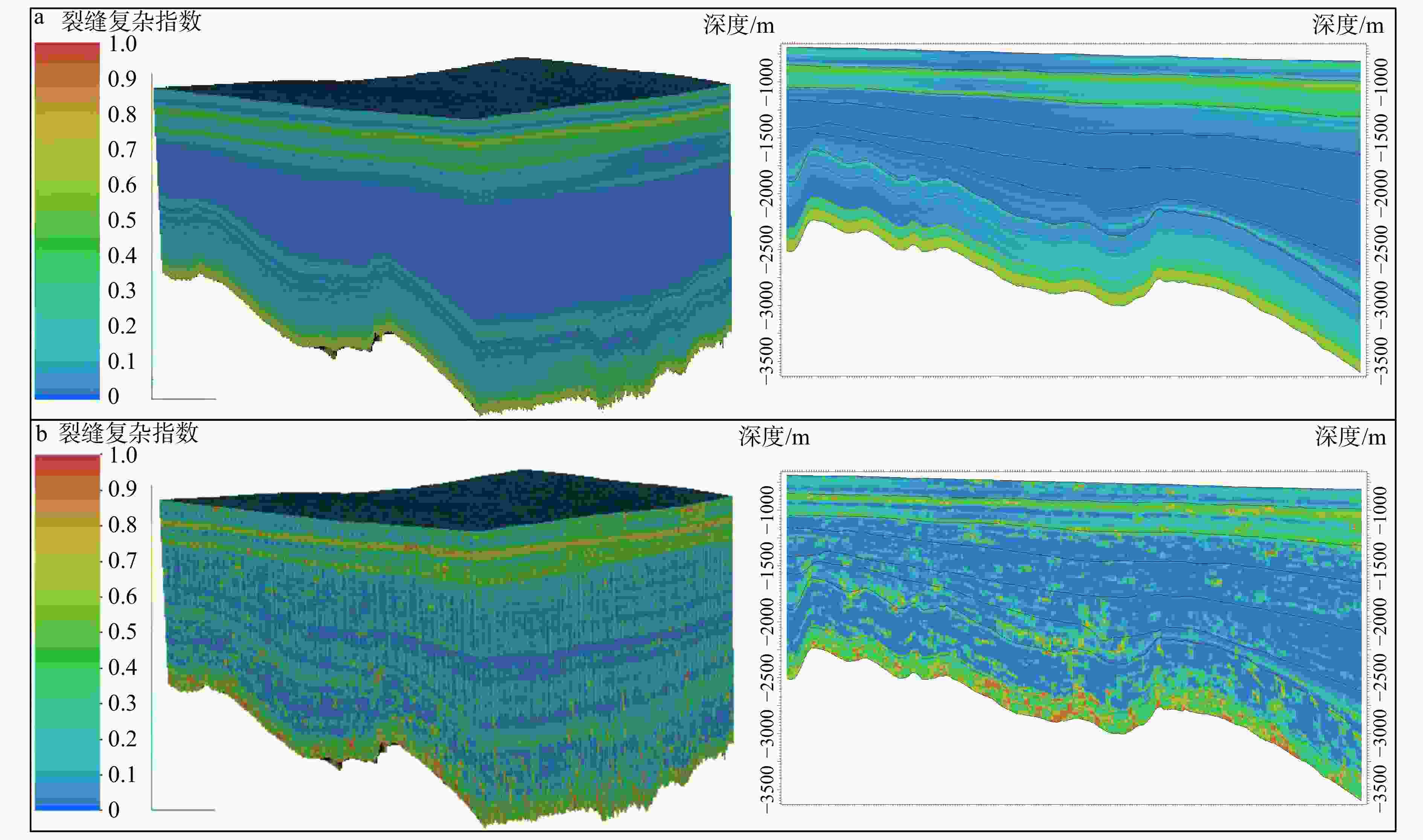 a—未采用蚂蚁体约束的裂缝复杂指数;b—采用产状控制蚂蚁体约束的裂缝复杂指数