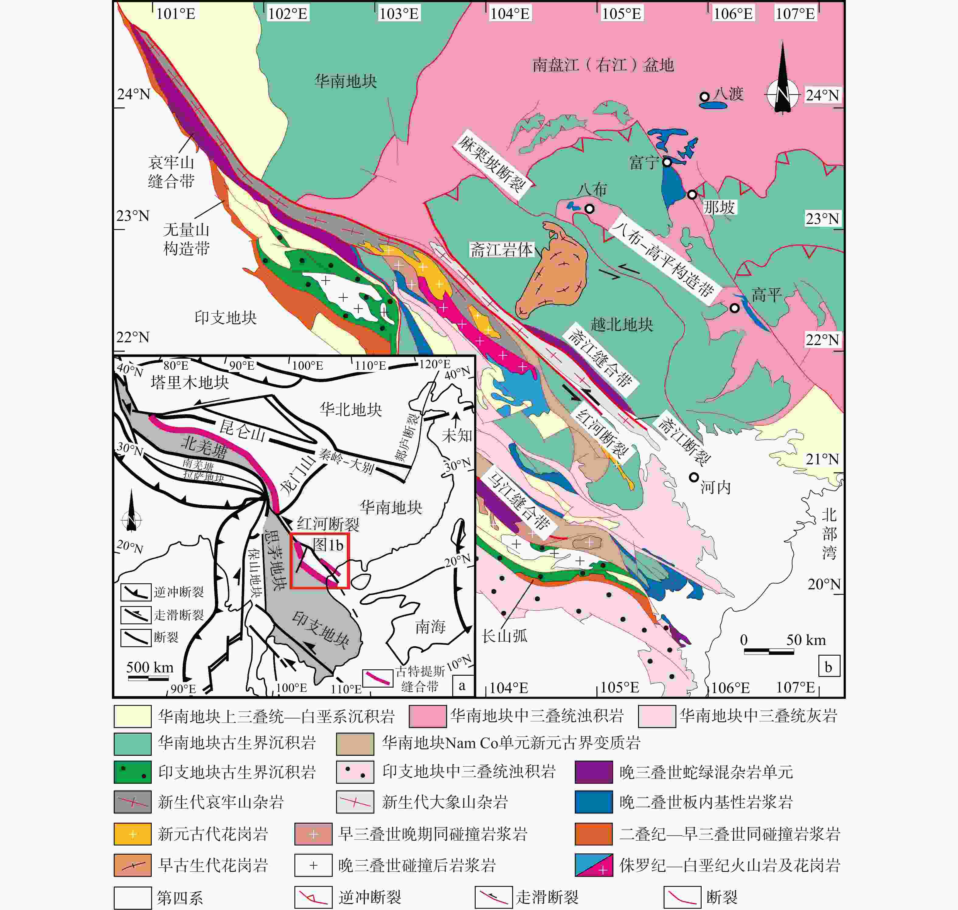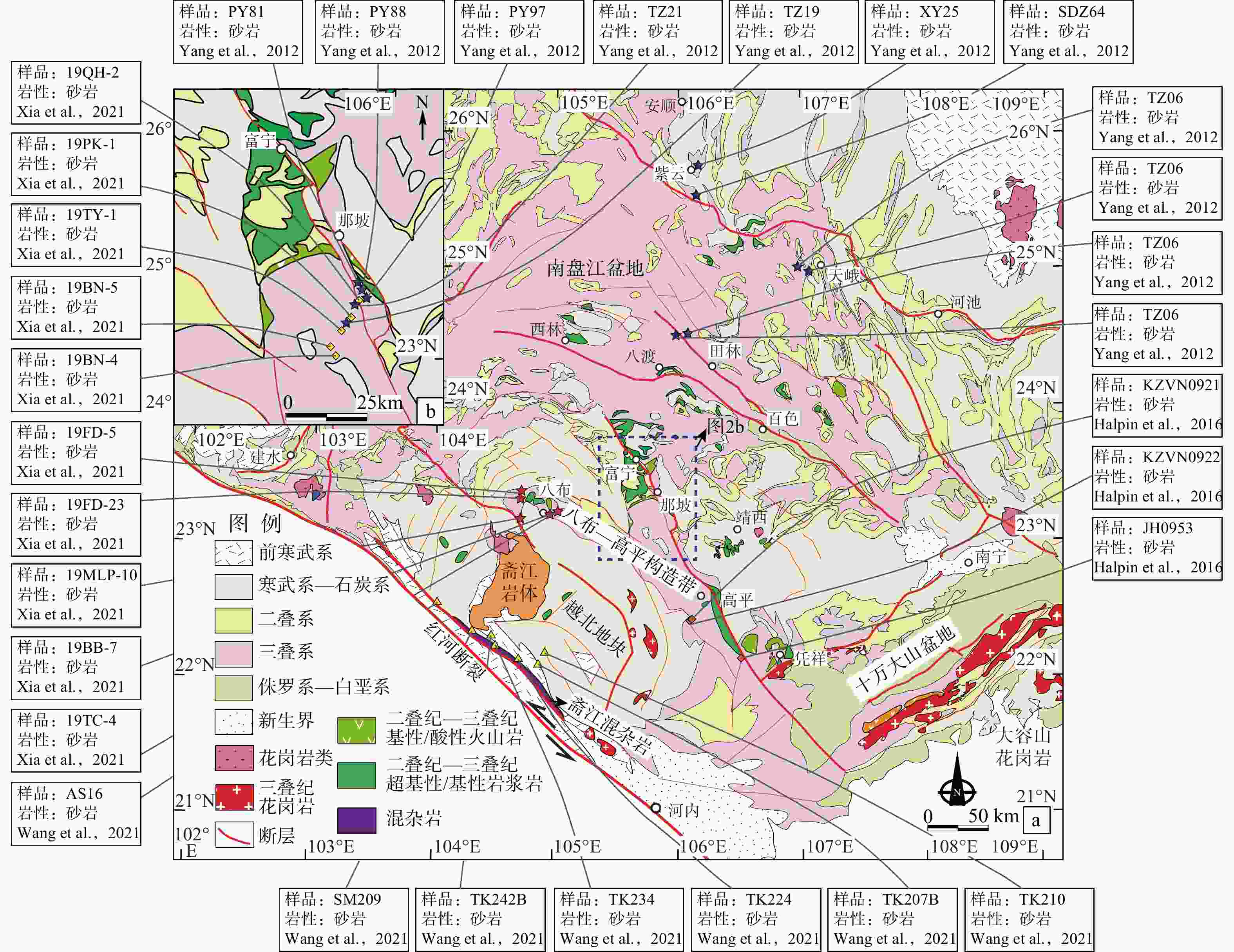 a—东南亚地区大地构造单元图;b—南盘江盆地、八布−高平构造带及越北地块区域地质简图(据Li et al.,2021修改)