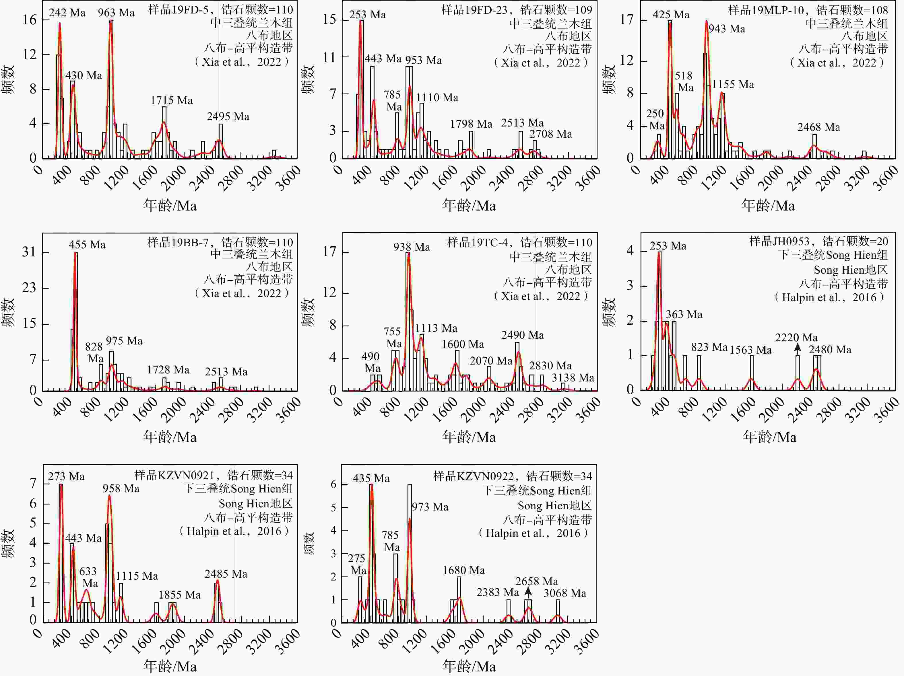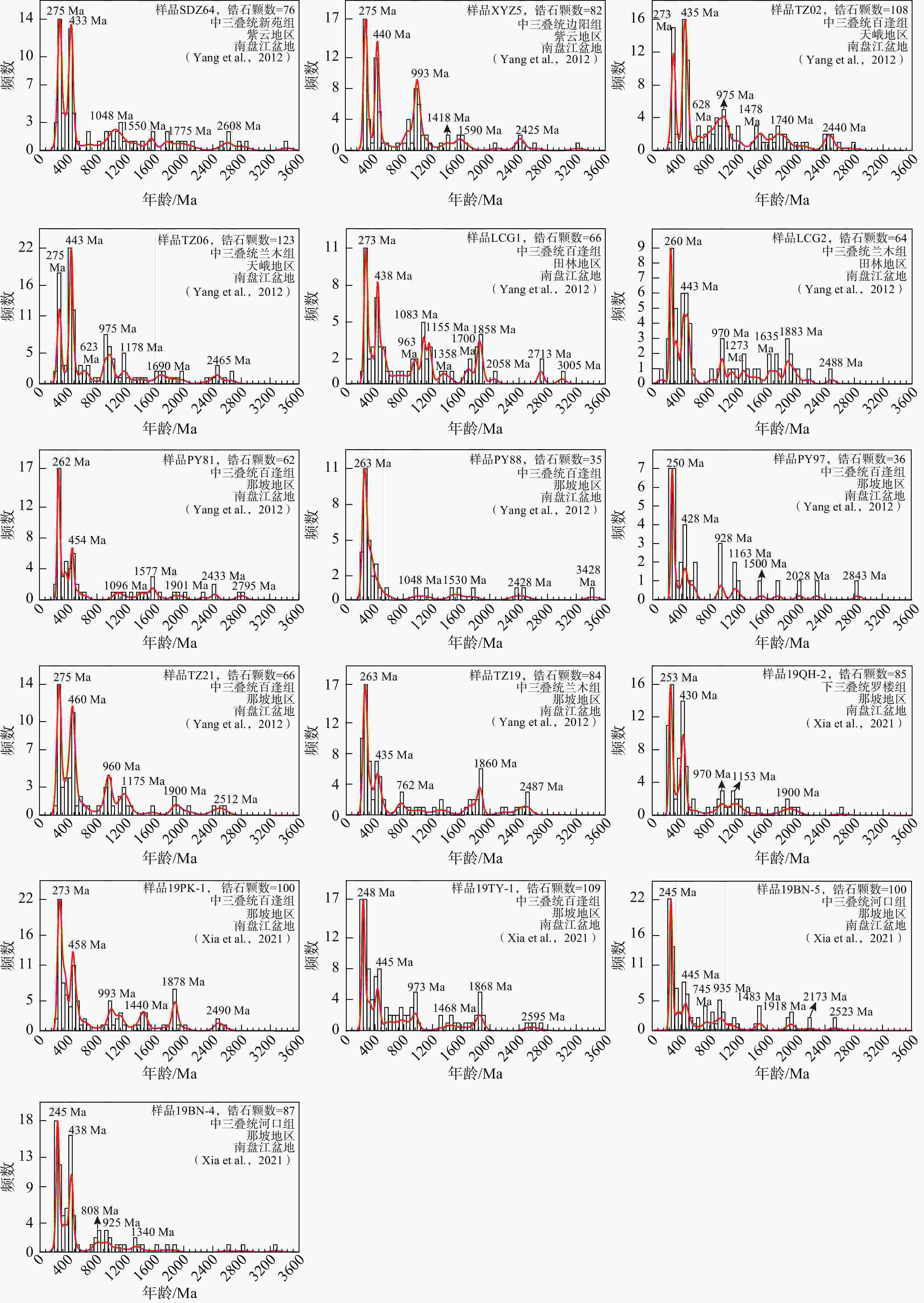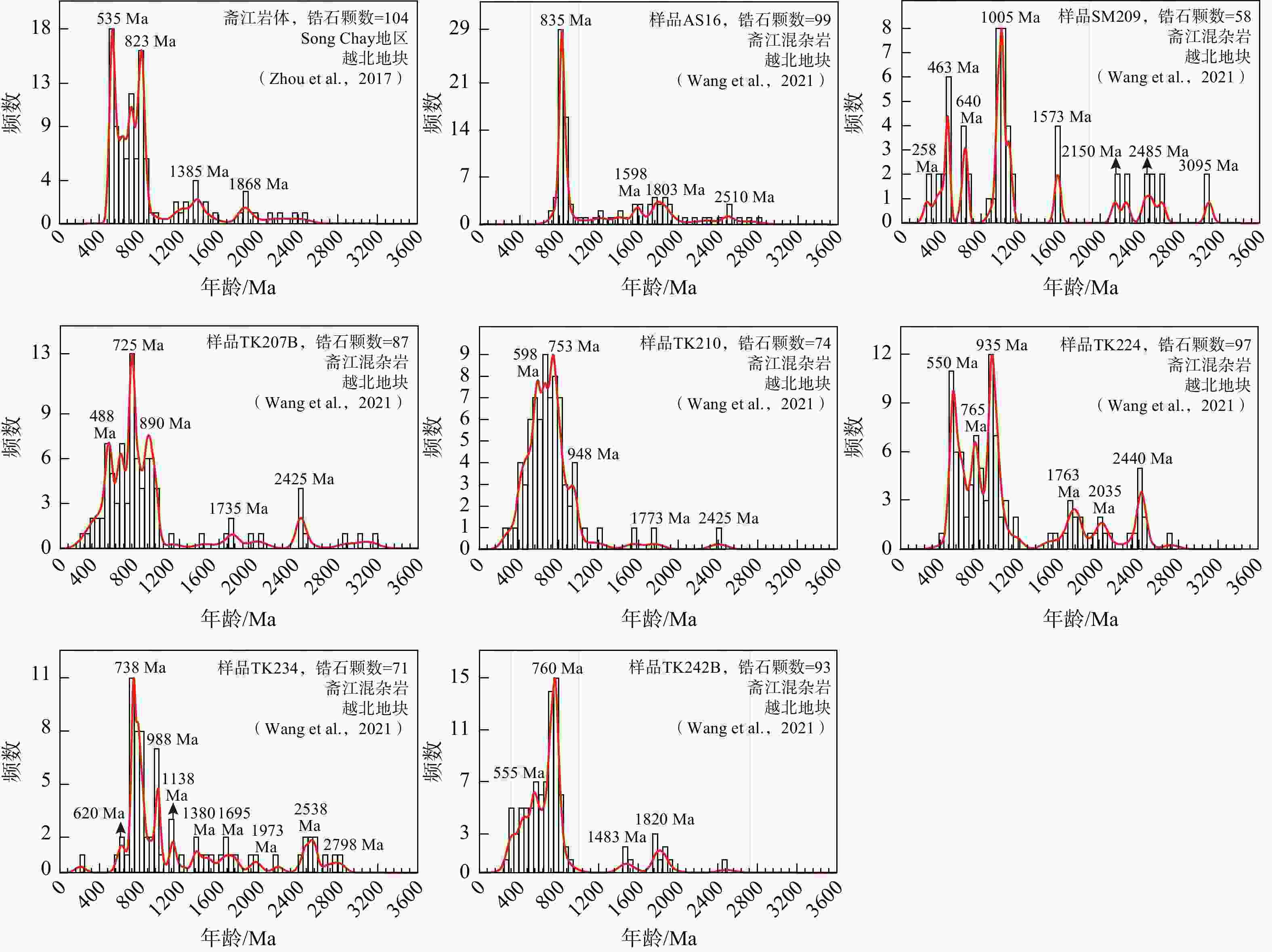 摘要: 古特提斯洋的形成与演化导致了冈瓦纳大陆北缘多个陆块的裂解分离、向北漂移并最终拼贴到亚洲大陆的南侧,该洋盆的闭合形成了多条蛇绿岩带。印支造山带作为古特提斯造山带的一部分,记录了古特提斯洋的演化历史,但其洋盆位置、俯冲极性等关键科学问题仍存在争议。回答上述问题的关键在于厘定中国−越南(中越)边境地区的八布−高平构造带的构造属性和越北地块的构造归属,即八布−高平构造带是否代表开阔洋盆的缝合带,以及越北地块是华南地块的组成部分还是一个独立的小陆块。因此,通过搜集华南地块西南缘南盘江盆地、中越边境地区的八布−高平构造带和越北地块3个构造单元中的31个碎屑岩锆石年龄数据和越北地块斋江岩体的岩浆结晶−继承锆石的年龄数据,进行了锆石年龄分布直方图和概率曲线谱峰对比。研究结果发现,这些样品多具有270~250 Ma、460~420 Ma、1000~900 Ma的年龄谱峰,另外年龄数据在1800 Ma左右以及2500 Ma左右也相对集中,这体现了3个构造单元物源存在较好的一致性。结合南盘江盆地和越北地块晚古生代—早中生代地层对比结果,以及同时期动物区系的相似性,研究推测自泥盆纪以来的伸展作用导致了八布−高平构造带在二叠纪时发育裂谷、深水沉积,甚至演化至初始洋盆;然而由于其扩张幅度有限,未发育成广阔的大洋,也未完全裂解进而阻断了越北地块和南盘江盆地的联系。越北地块是华南地块的重要组成部分,古特提斯开阔洋盆应位于越北地块南侧区域。研究成果为印支造山带中大地构造单元划分提供了证据和论证,对理解中越边境地区印支造山作用和过程具有一定程度的指导价值。Abstract: