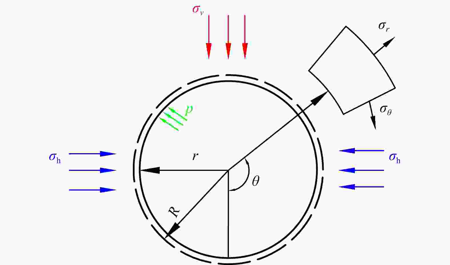 σv—竖直方向应力,σh—水平方向应力,p—应力计内部压力;R—应力计受压变化前的半径;r—应力计受压变化后的半径;σr—径向应力;σθ—环向应力;σh—水平方向应力