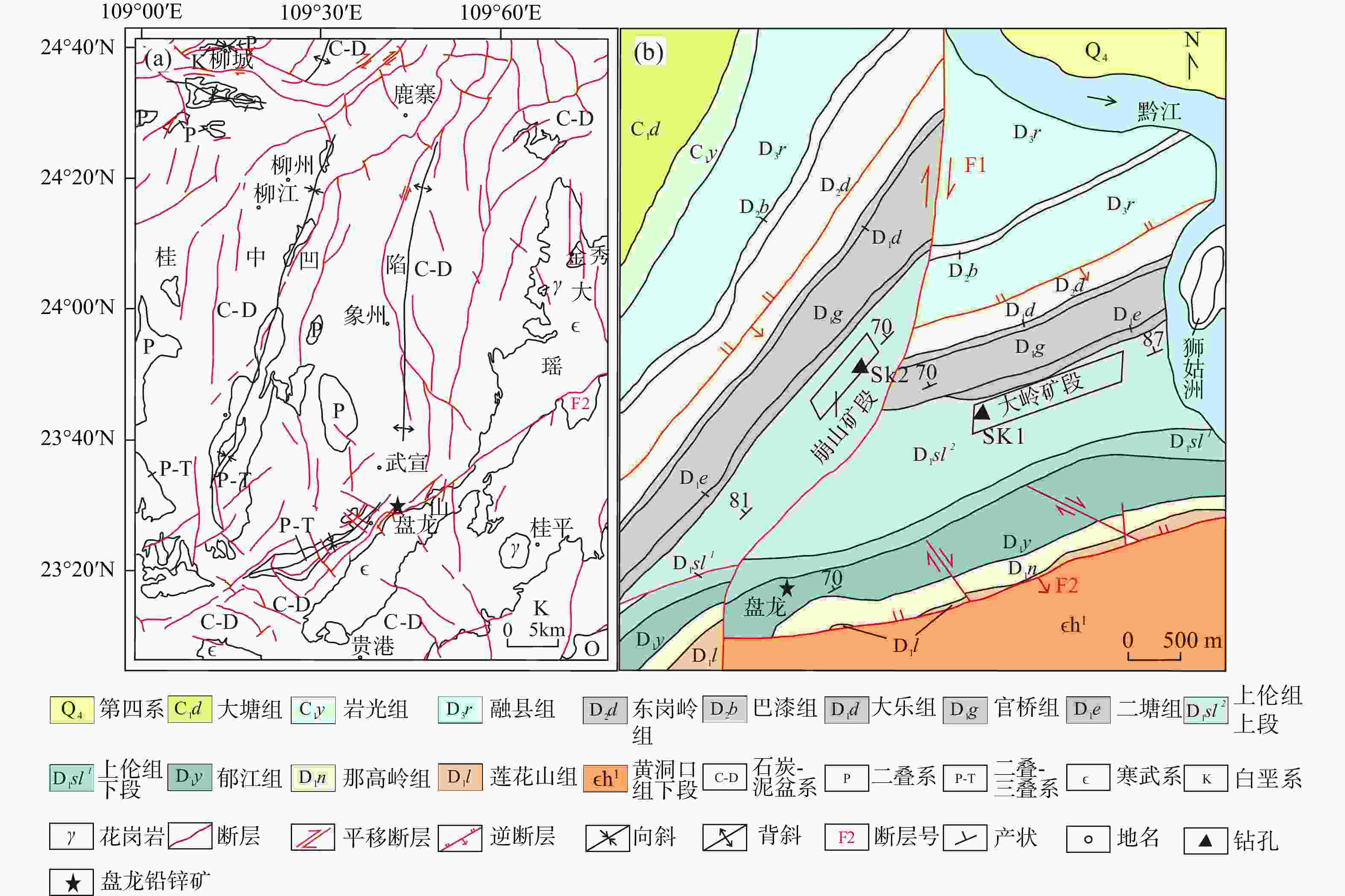 图 1 盘龙铅锌矿区周边构造纲要图及矿区地质图(据安鹏鑫,2019;覃佳肖,2023修改)