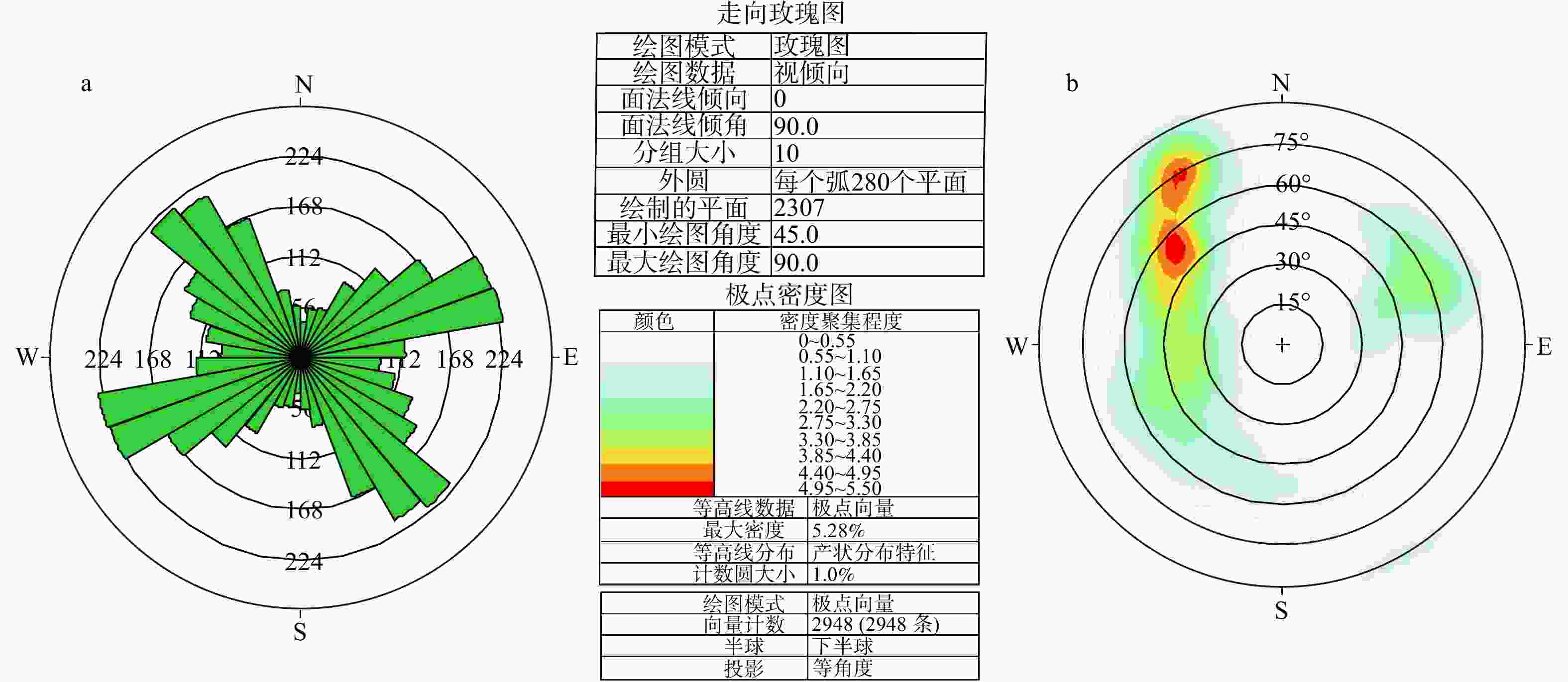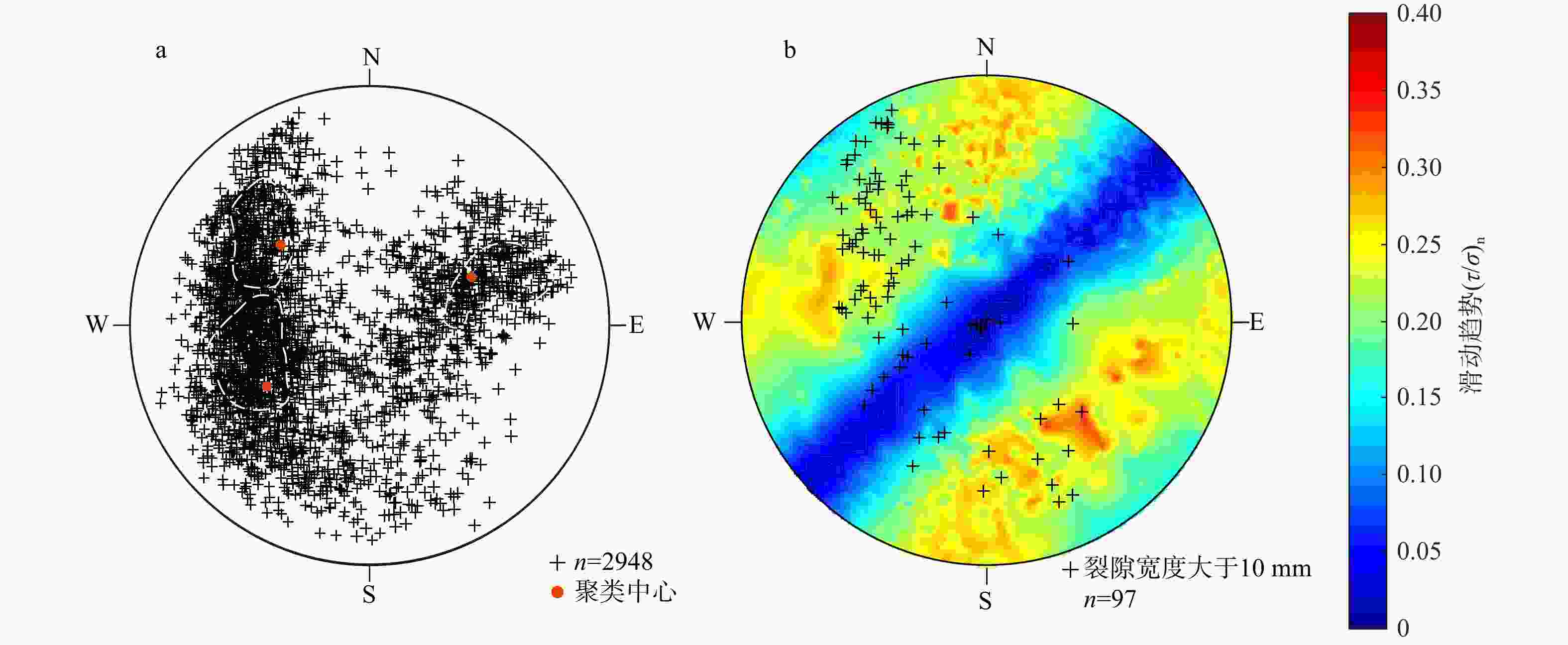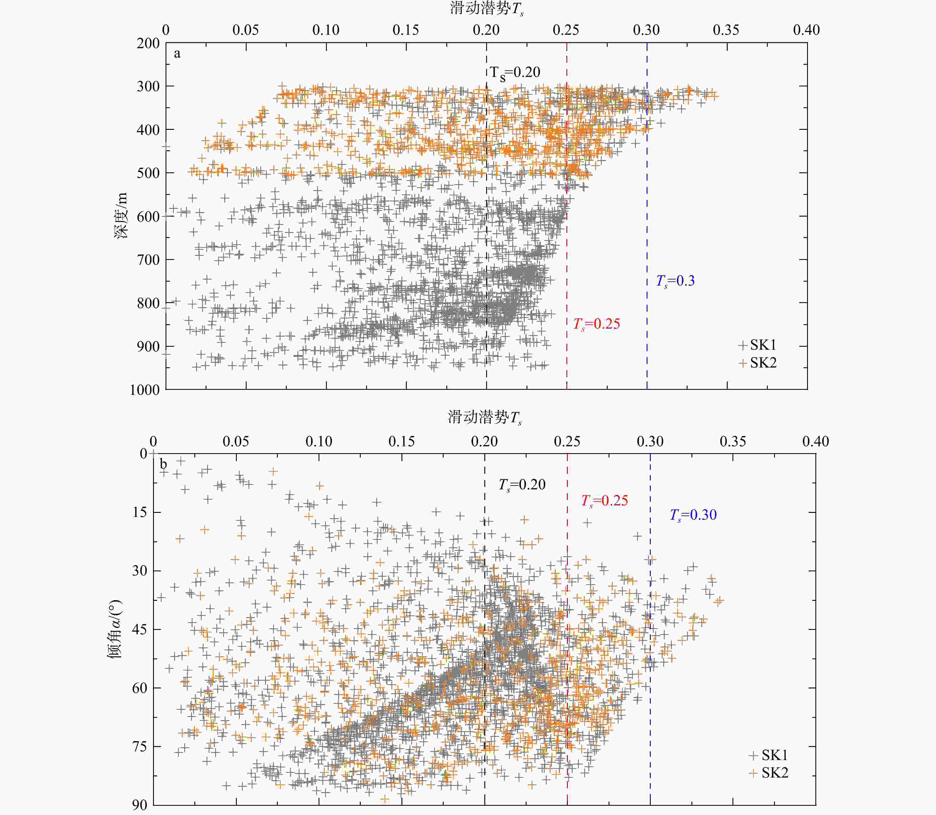 摘要: 广西盘龙铅锌矿是桂中地区重要的多金属矿产资源,其深部开采受岩体结构面和地应力场控制显著。为系统评估该矿深部结构面的稳定性,揭示高地应力与构造裂隙耦合作用下的滑动机制,保障深部矿山开采安全,综合采用超声波钻孔电视与水压致裂技术,获取SK1与SK2钻孔的结构面与地应力数据。结合Sheorey模型与应力张量变换方法,计算结构面上剪应力与正应力,基于摩擦滑动准则对2948组结构面进行稳定性评价。结果表明:矿区岩体结构面以陡倾角为主,优势倾向为北西—北北西向和北东—北东东向。在500~850 m深度范围内,三向主应力值分别SH:28.29~44.69 MPa,Sh:19.46~27.09 MPa,Sv:14.50~22.68 MPa;SH方向为北西—北北西,Sh方向为北东—北东东。侧压力系数平均值kH = 2.07、kh = 1.28,表明三向主应力关系为SH>Sh>Sv,水平应力占主导地位,现今构造应力场以北西向挤压为主,与区域构造应力场方向一致。北西—北北西向结构面群在当前高应力环境下具有较高的剪切再活化风险,尤其是滑动潜势Ts>0.20且裂隙宽度>10 mm的结构面,应作为重点监测与加固对象。研究成果可为深部开采巷道布设优化、支护设计及灾害防控提供科学依据。Abstract: