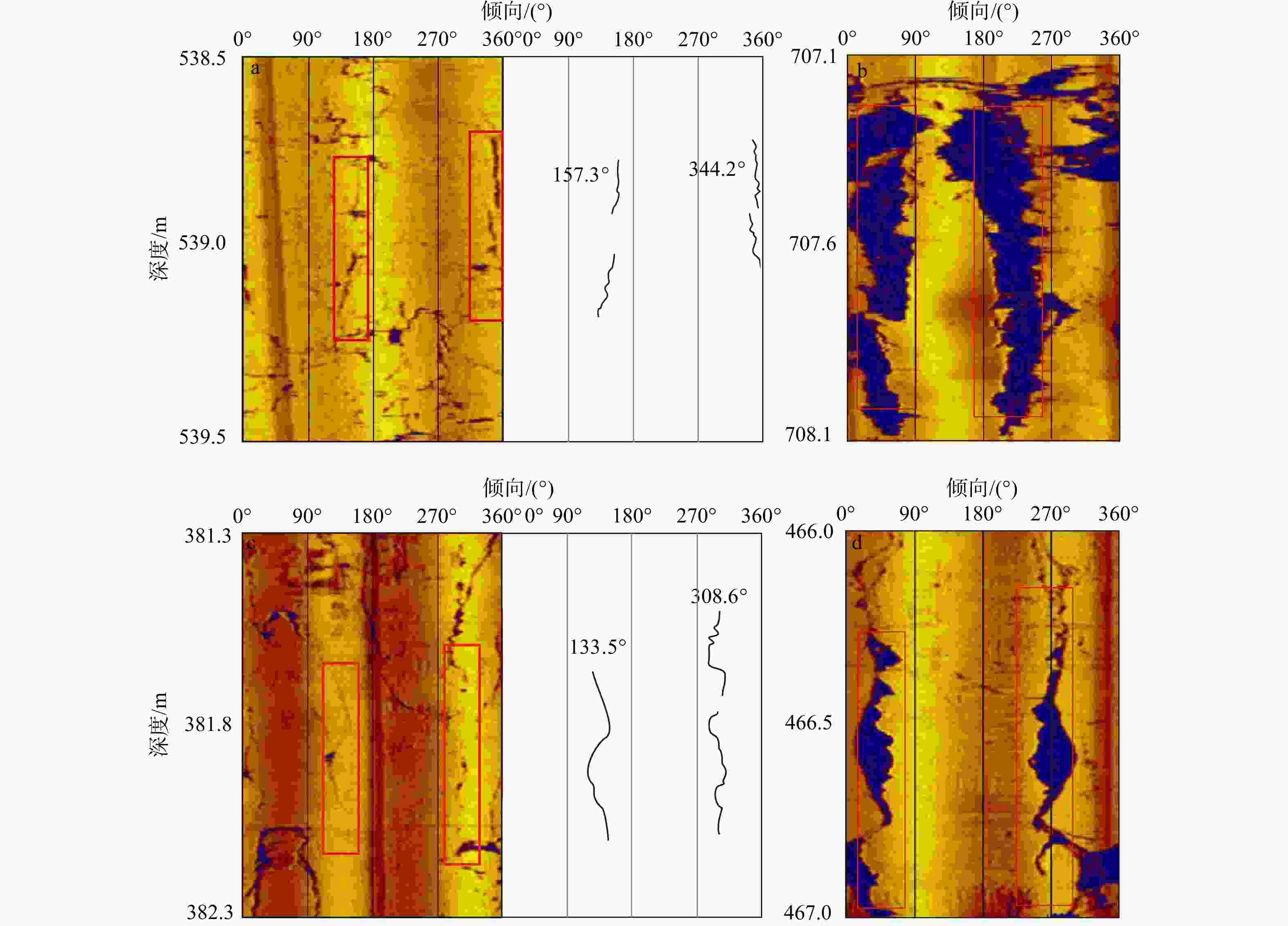 (a) Drilling-induced tensile fractures in borehole SK1; (b) Borehole breakouts in borehole SK1; (c) Drilling-induced tensile fractures in borehole SK2; (d) Borehole breakouts in borehole SK2Yellow areas: intact rock mass; Blue-black areas: fractured zone in the borehole; Red rectangular boxes: locations of drilling-induced tensile fractures and borehole breakouts