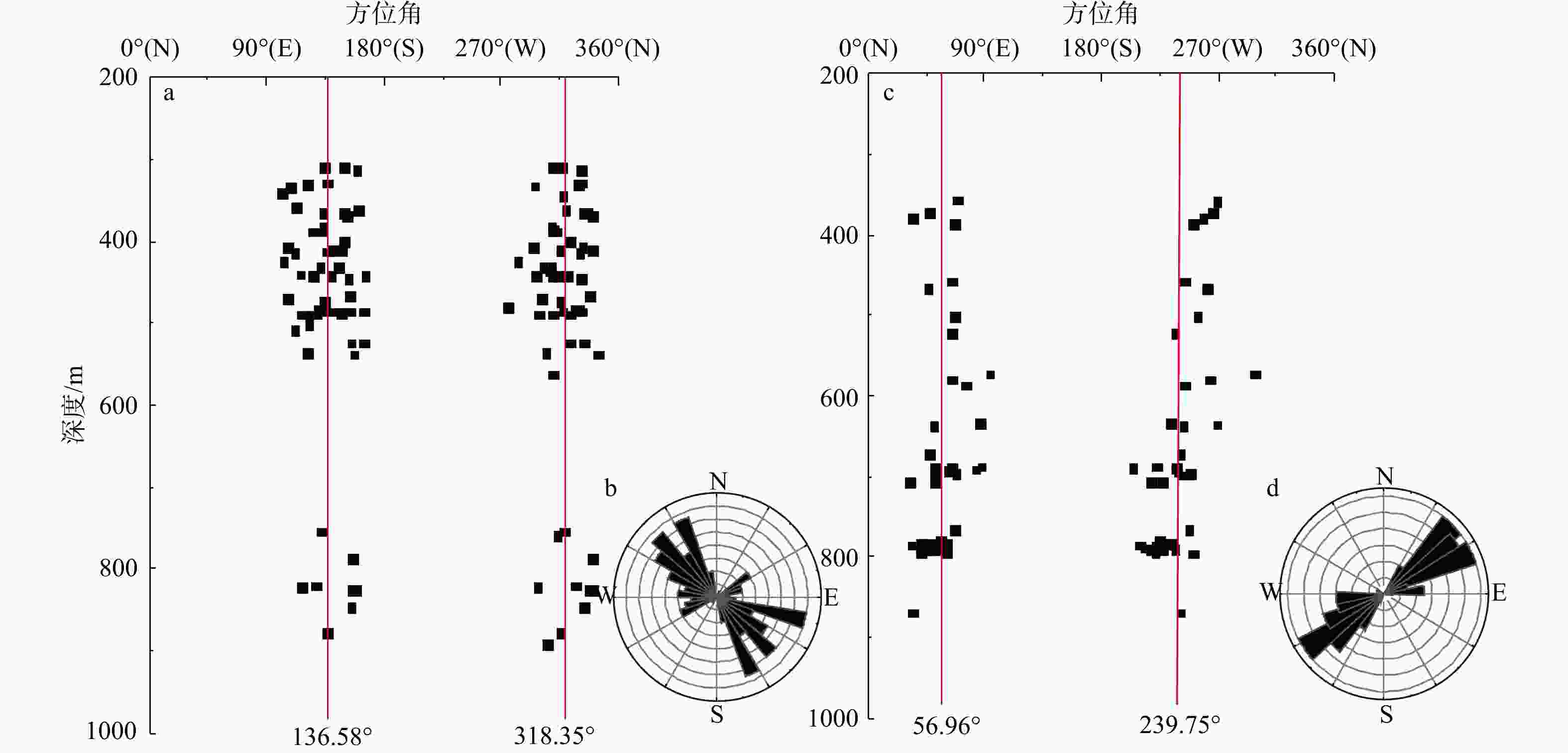 散点代表各深度与方位上的裂隙及崩落位置;红色竖线代表诱发裂隙的平均方位角a—诱发裂隙分布散点图;b—诱发裂隙方位玫瑰图;c—钻孔崩落分布散点图;d—钻孔崩落方位玫瑰图