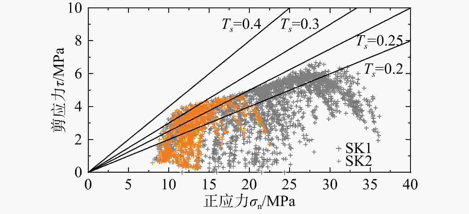 Figure 7. Relationship between shear stress and normal stress of structural planes in boreholes SK1 and SK2