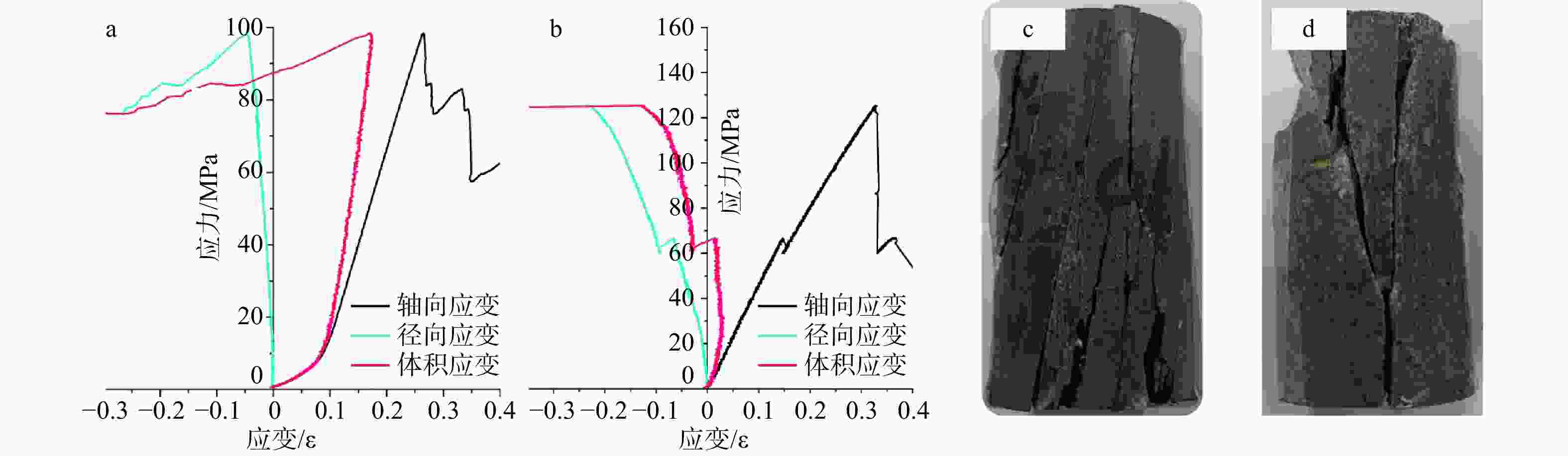 a—纹层状页岩应力−应变曲线;b—薄层状页岩应力−应变曲线;c—纹层状岩芯破裂形态图;d—薄层状岩芯破裂形态图