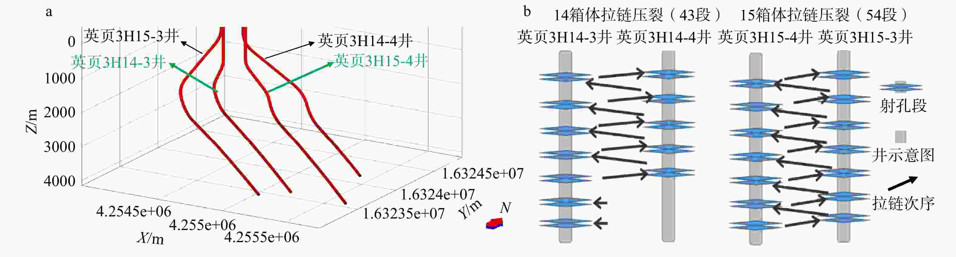 a—英页3H平台4口井轨迹示意图;b—英页3H平台4口井拉链式压裂次序