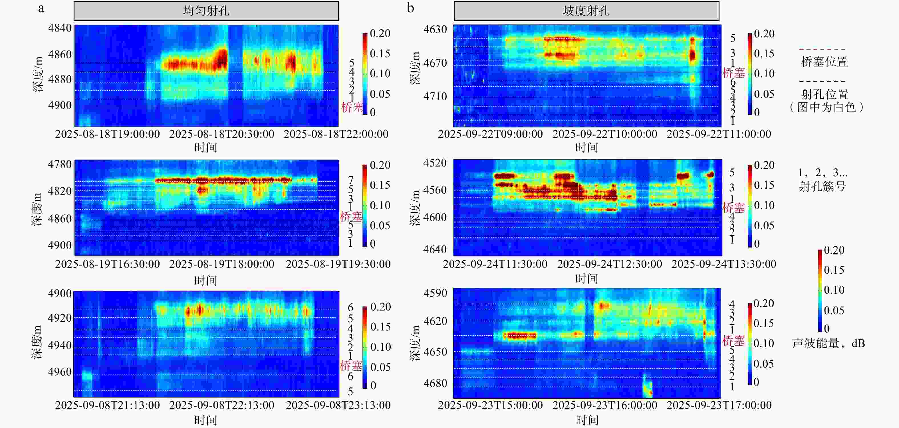 a—桥塞入井8小时外压裂光纤DAS示意图;b—桥塞入井8小时内压裂光纤DAS示意图