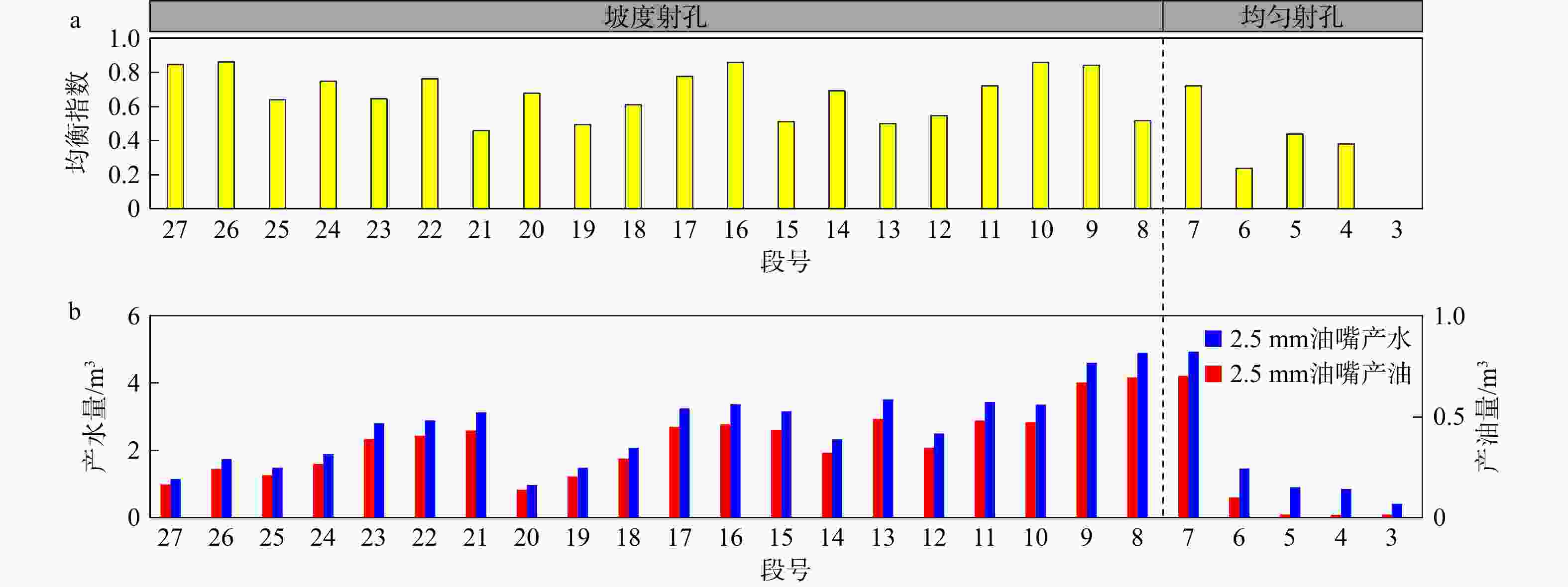 a—英页3H15-4井压裂后各段均匀指数柱状图;b—-英页3H15-4井压裂后各段产出效果柱状图