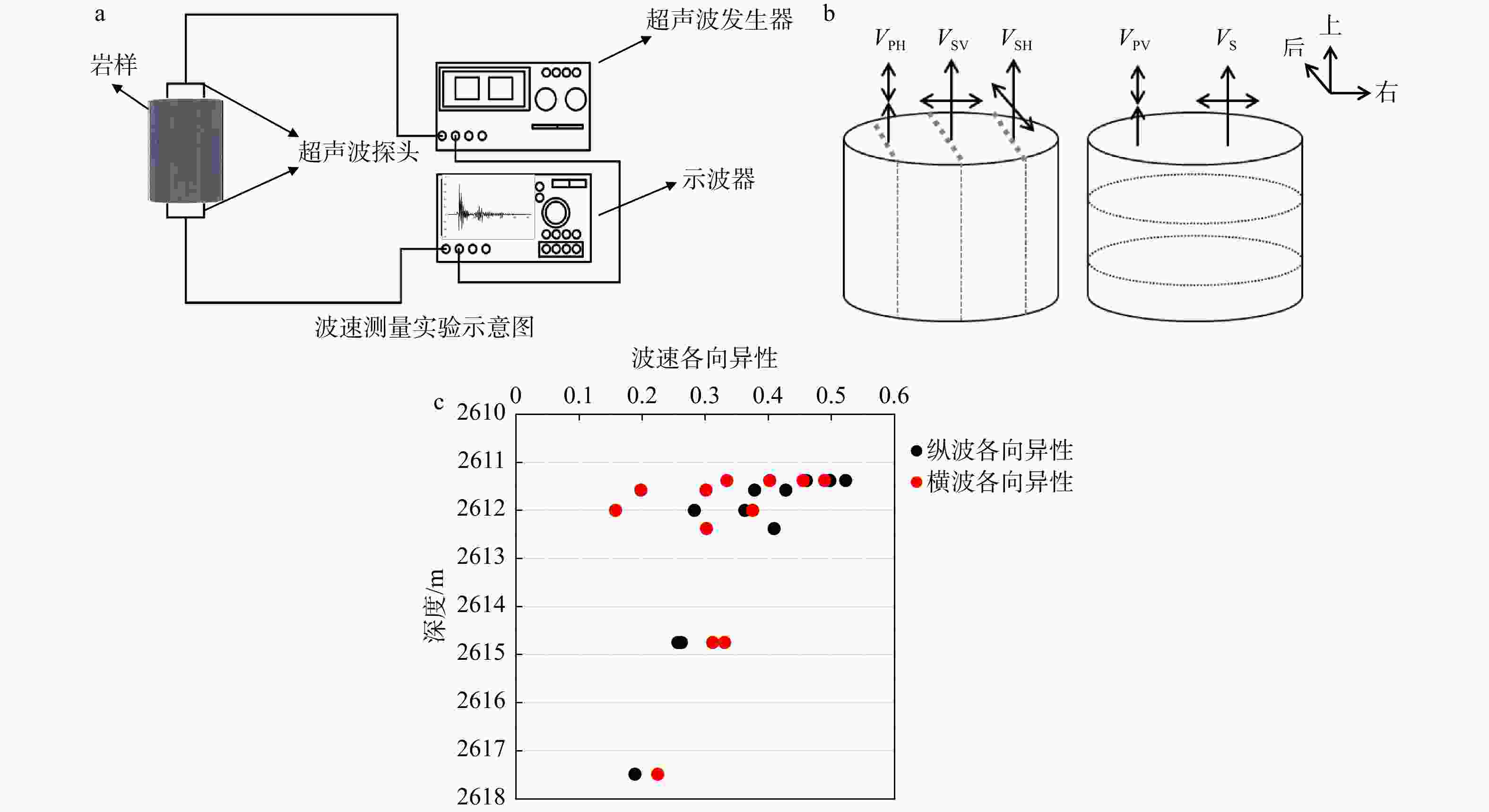 a—超声波测试实验示意图;b—样品波速测量示意图;c—纵、横波波速各向异性统计图