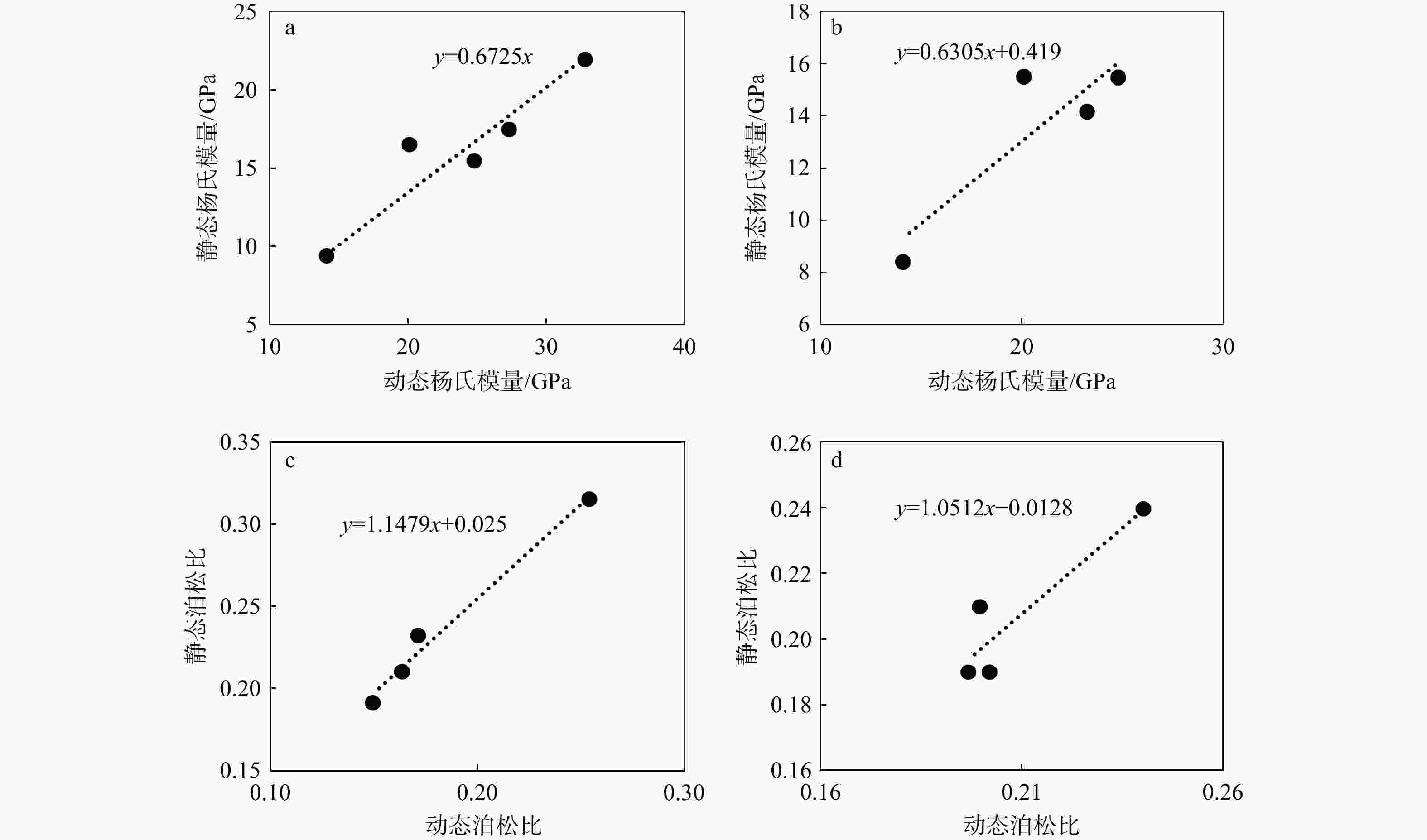 a—横向动、静态杨氏模量转换关系;b—纵向动、静态杨氏模量转换关系;c—横向动、静态泊松比转换关系;d—纵向动、静态泊松比转换关系