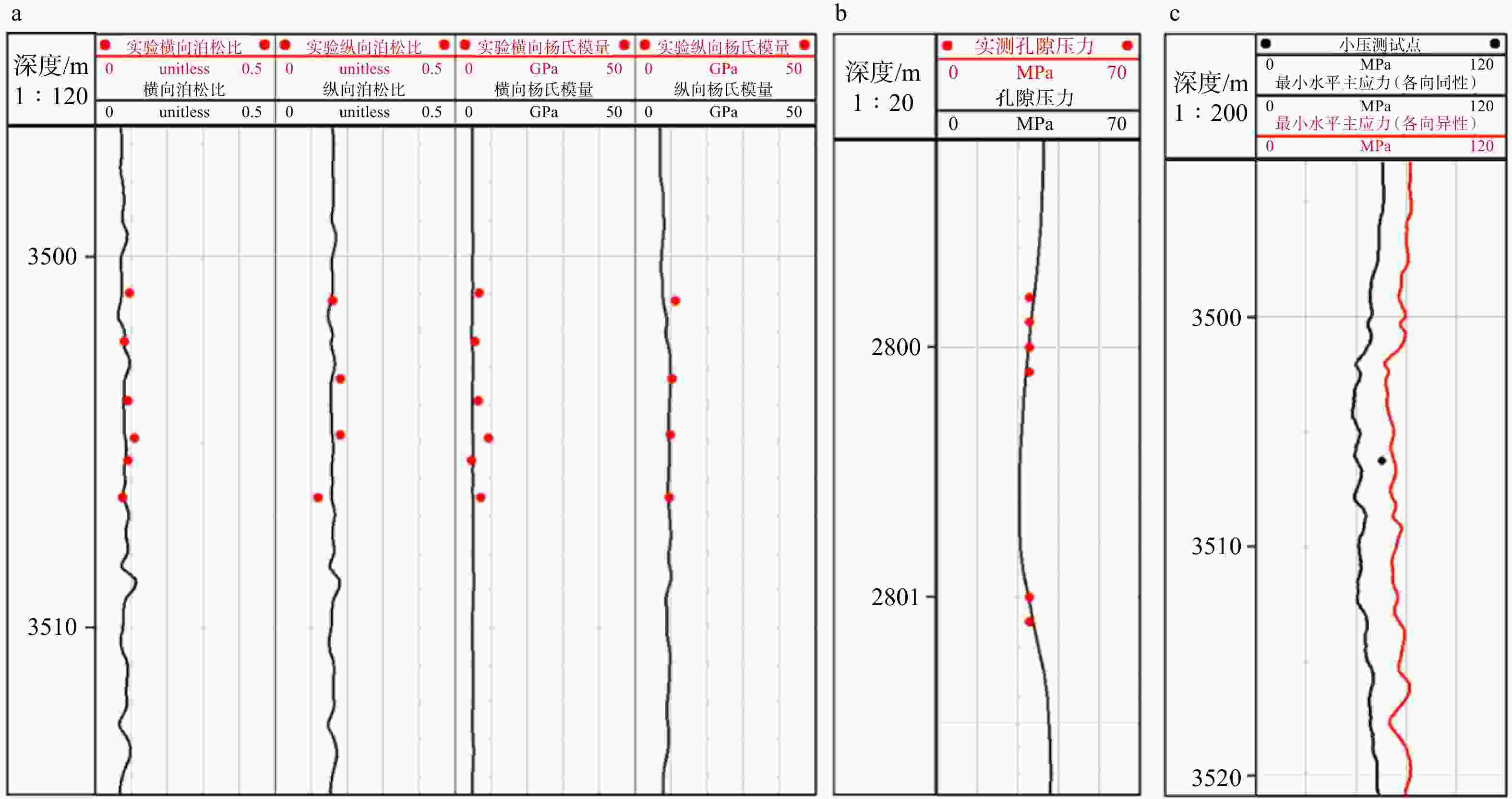 摘要: 页岩油储层甜点段纵向变化快、具有厘米级薄互层和层理发育的特征,且各向异性强。传统各向同性模型难以满足精细的地质力学建模与表征,给油气藏改造与压裂方案设计等带来了挑战。地质力学是实现复杂地质特征油气田效益开发的关键。为了获得高精度一维地质力学模型,开展了页岩油储层各向异性室内实验,同时结合测井数据进行一维地质力学建模,分析地质力学特征。结果表明:通过各向异性实验研究,系统获得了页岩各向异性岩石力学参数;基于实验结果及各向异性模型,由声波测井资料等构建了沿地层深度方向的各向异性刚度矩阵,从而获得杨氏模量、泊松比各向异性表征以及抗压强度等力学参数。根据声波密度曲线确定研究区块的卸载特征,使用Bowers卸载理论计算孔隙压力,并通过现场模块化动态地层测试数据进行校准。在此基础上,结合高精度各向异性岩石力学模型和孔隙压力,采用各向异性弹性模型求取了更高精度的两向水平主应力,进而构建了高精度的一维各向异性地质力学模型,精度较各向同性模型大幅提高。该模型通过了井史资料等现场数据的验证,揭示了沿井筒的各向异性地质力学参数及原位地应力展布特点。研究成果为油气地质工程一体化提供了基础,为油气藏的改造与压裂方案设计提供了理论依据与技术支撑。Abstract: