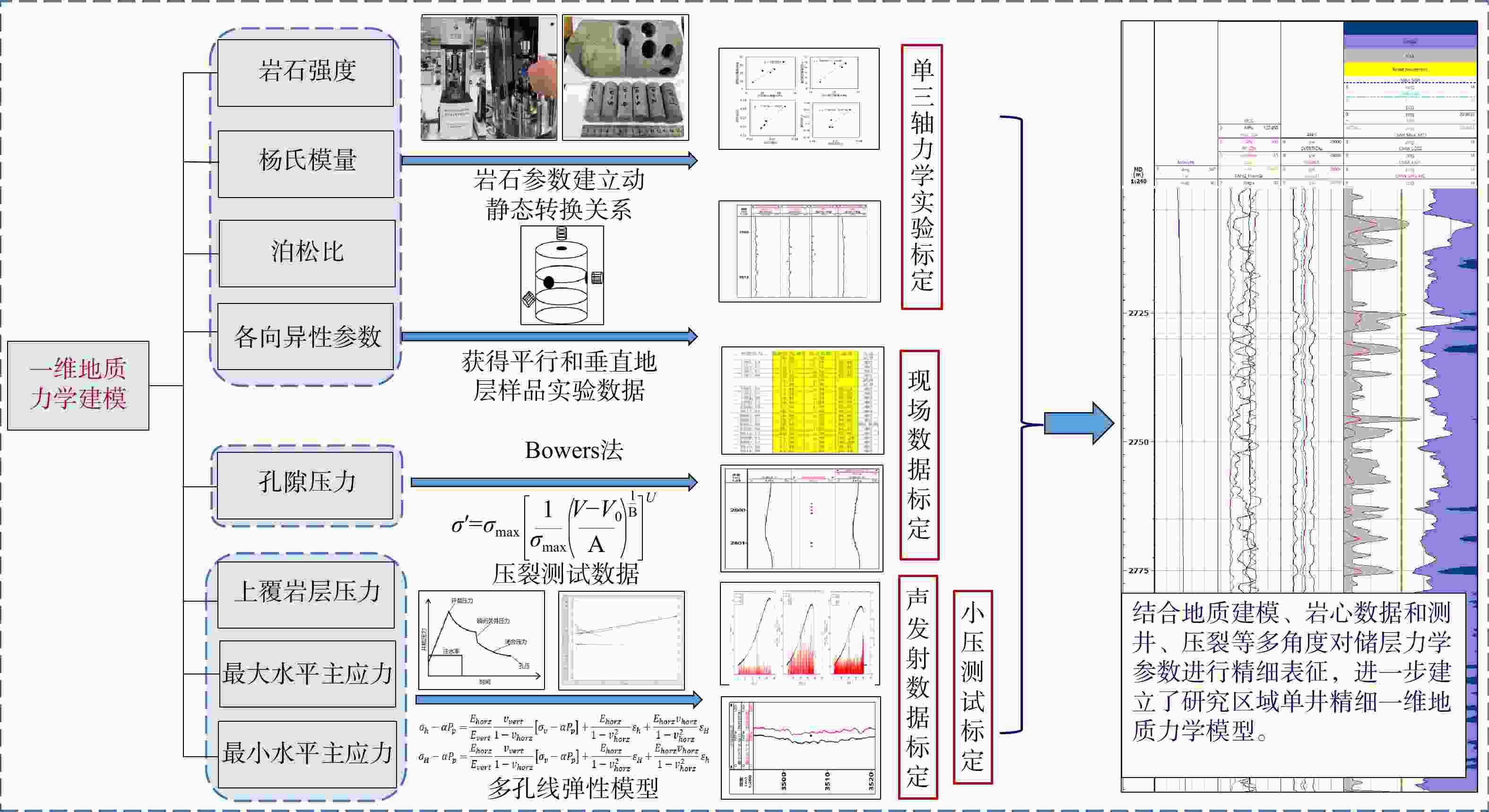 Objective The sweet spot intervals of shale oil reservoirs exhibit rapid vertical variations, are characterized by centimeter-scale thin interbeds and well-developed bedding planes, and possess strong anisotropy. Traditional isotropic models are therefore inadequate for detailed geomechanical modeling and characterization, posing significant challenges for reservoir stimulation and hydraulic fracturing design. Methods Geomechanics is key to the cost-effective development of oil and gas reservoirs with complex geological features. To establish a high-precision 1D geomechanical model, anisotropy experiments on shale oil reservoirs were conducted in the laboratory, perform 1D geomechanical modeling using well log data to analyze geomechanical characteristics. Results Systematically obtaining the anisotropic rock mechanical parameters of shale. Based on the rock mechanics experimental results and the anisotropic model, the depth-wise anisotropic stiffness matrix of the formation was derived from acoustic logging data, thereby obtaining anisotropic characterizations of mechanical parameters such as Young’s modulus, Poisson’s ratio, and compressive strength. Based on the acoustic-density log curves, the unloading characteristics of the study block were identified. Pore pressure was calculated using the Bowers unloading theory and calibrated with field Modular Formation Dynamics Tester data. By integrating a high-precision anisotropic rock mechanics model with pore pressure data, a higher-accuracy two-way horizontal principal stress field was derived using an anisotropic elastic model. This enabled the construction of a high-precision 1D anisotropic geomechanical model, demonstrating significantly improved accuracy compared to the isotropic model. Conclusions This study established an anisotropic 1D geomechanical modeling workflow, which provides a theoretical basis and technical support for oil and gas reservoir stimulation and fracturing program design. Systematic laboratory experimental studies on shale oil reservoir anisotropy were conducted to obtain the anisotropic rock mechanical parameters of the shale. These parameters were used to provide anisotropic rock mechanical data for the 1D geomechanical modeling. Based on the high-precision anisotropic rock mechanical model and pore pressure, the anisotropic elastic model was employed to determine the two-way horizontal principal stress with higher accuracy. The precision was significantly improved by approximately 7% compared to the isotropic model. The model was validated against field data such as well history records, revealing the distribution characteristics of anisotropic geomechanical parameters and in-situ stress along the wellbore. [ Significance ] The research findings serve as a foundational basis for the integration of Geo-engineering Integration, providing theoretical guidance and technical support for reservoir stimulation and hydraulic fracturing design. -