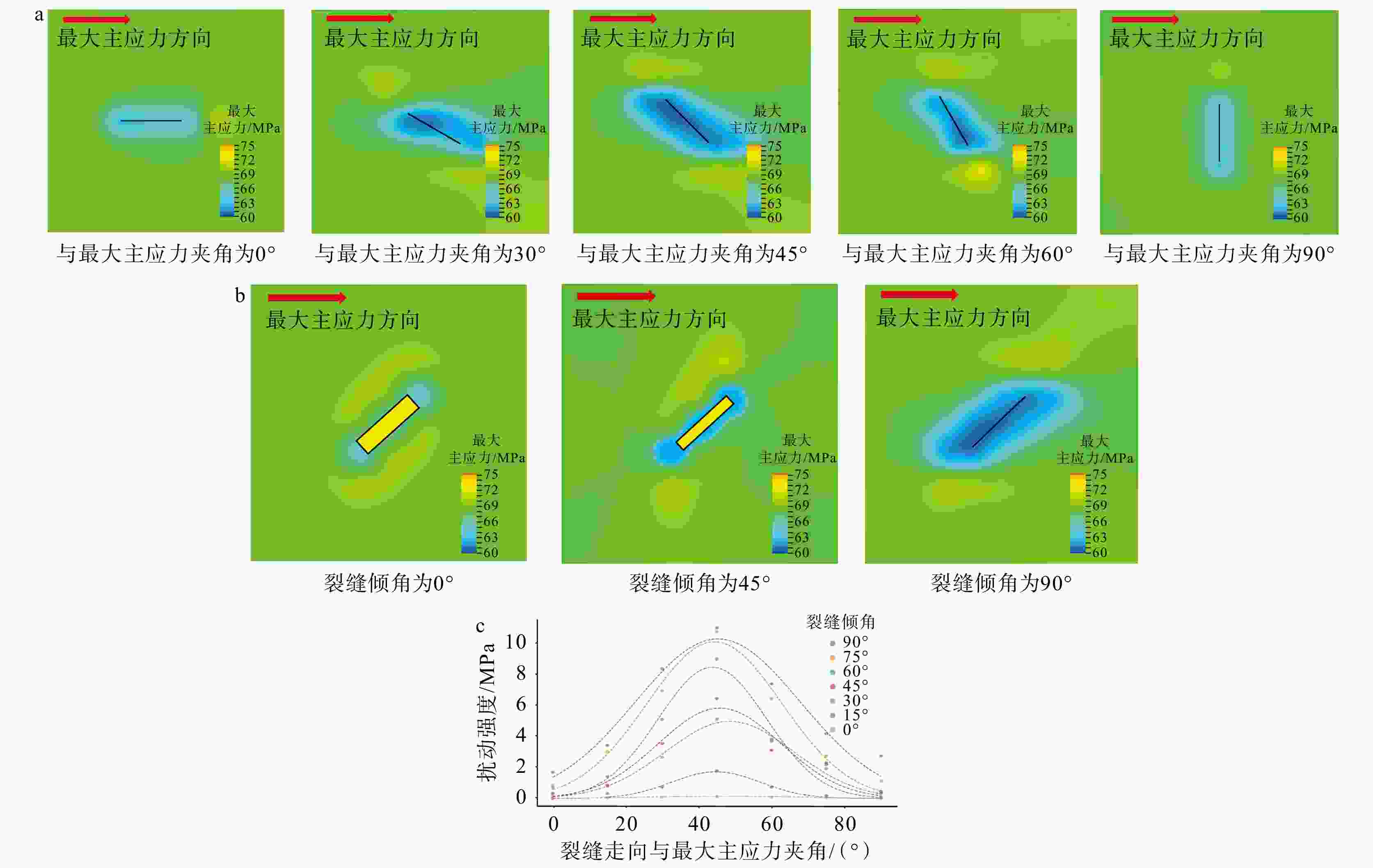 a— 裂缝走向对地应力影响模拟;b— 裂缝倾角对地应力影响模拟;c—不同倾角、不同夹角裂缝对地应力扰动强度的影响