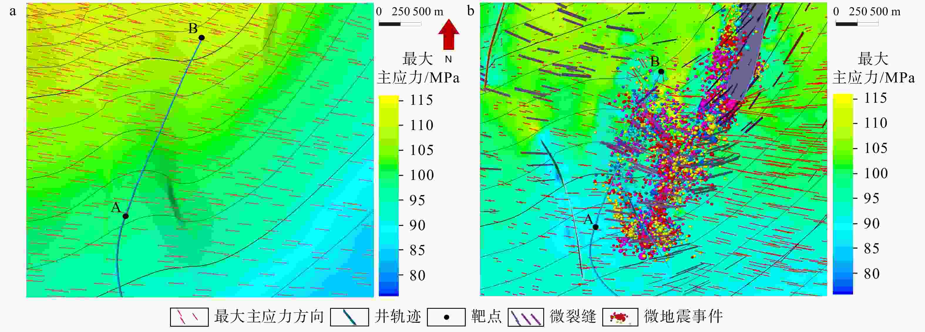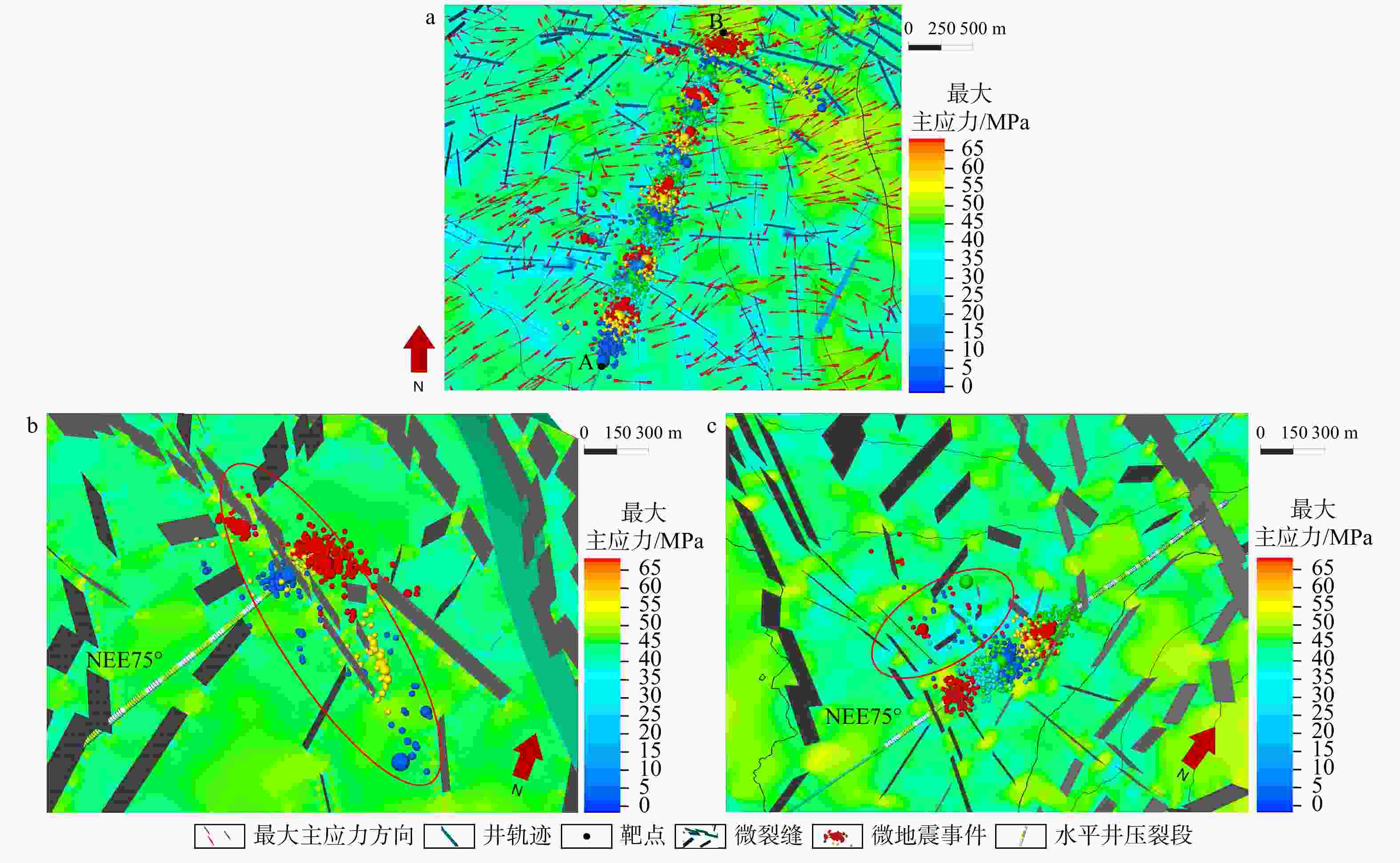 A、B为水平井A、B靶点;彩球为水平井压裂的微地震事件;层间黑线为小层底界线;黑色虚线为靶窗顶、底界;线号、道号间隔为20 ma—高分辨率反演直接赋值法有限元模拟最小主应力剖面;b—井周精细地质建模有限元模拟最小主应力剖面;c—井周精细地质建模有限元模拟最小主应力剖面叠加微地震事件