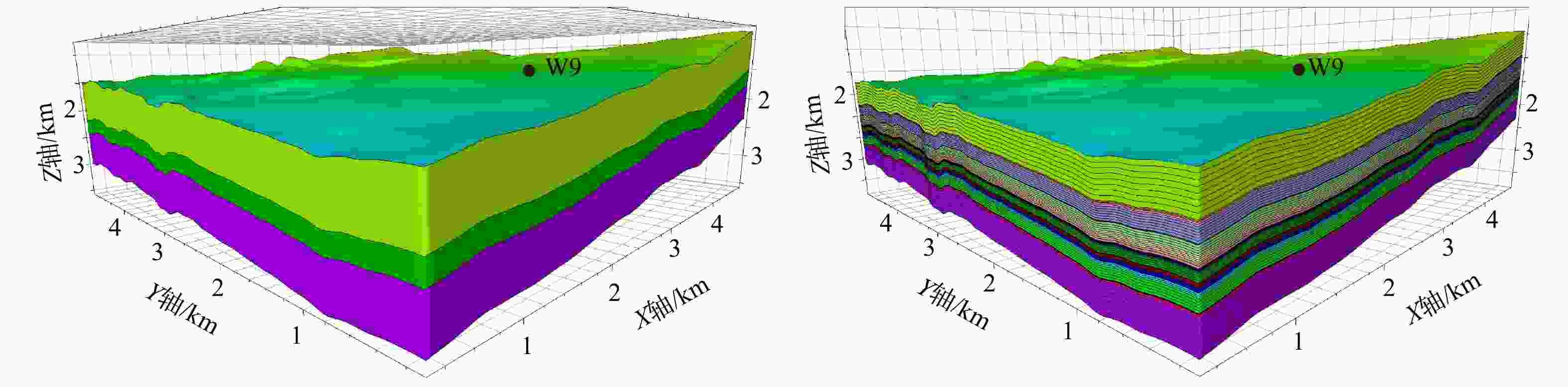 黑点为W9井所在模型中的位置;Z轴为向下递增a—大型区域地质力学格架模型;b—井周局部精细格架模型