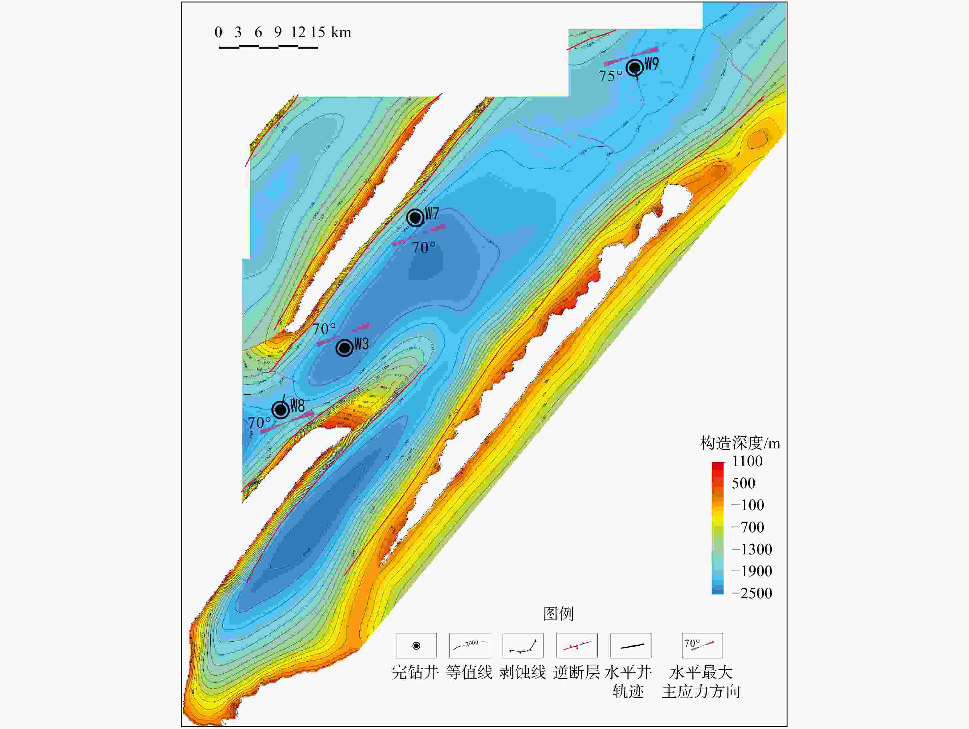摘要: 陆相页岩油岩性纵横向变化较快,纹层、夹层发育,非均质性强。以往针对五峰−龙马溪组等深层页岩气攻关的地质力学研究多以区域性建模预测为主,建模网格较粗,缺乏对储层纵向的精细刻画,不适用于非均质性较强的陆相地层。此外,水力裂缝、天然裂缝与地应力之间的相互影响关系需要进一步明确,压裂成缝的关键因素需要进一步厘清。为应对陆相页岩储层非均质性较强的问题,该研究旨在建立适用于陆相页岩的井周精细地质力学模型,以预测井周应力场的分布和局部应力扰动特征,进一步分析断裂、裂缝、构造样式对井周应力扰动的影响。将该方法应用于川东南复兴地区陆相页岩储层评价,结果表明:纵向上,凉高山组陆相页岩储层顶底高应力砂岩层发育,对压裂裂缝的纵向扩展存在一定影响,而⑥号小层内部应力较为均一,该小层中部是水平井轨迹最佳穿行层位;平面上,裂缝发育会导致局部应力方向发生偏转且应力值降低,当裂缝走向与最大主应力方向夹角为45°时,应力扰动最为显著。建模预测结果为水平井轨迹方位优选、靶窗确定及工程施工提供重要参考依据。Abstract: