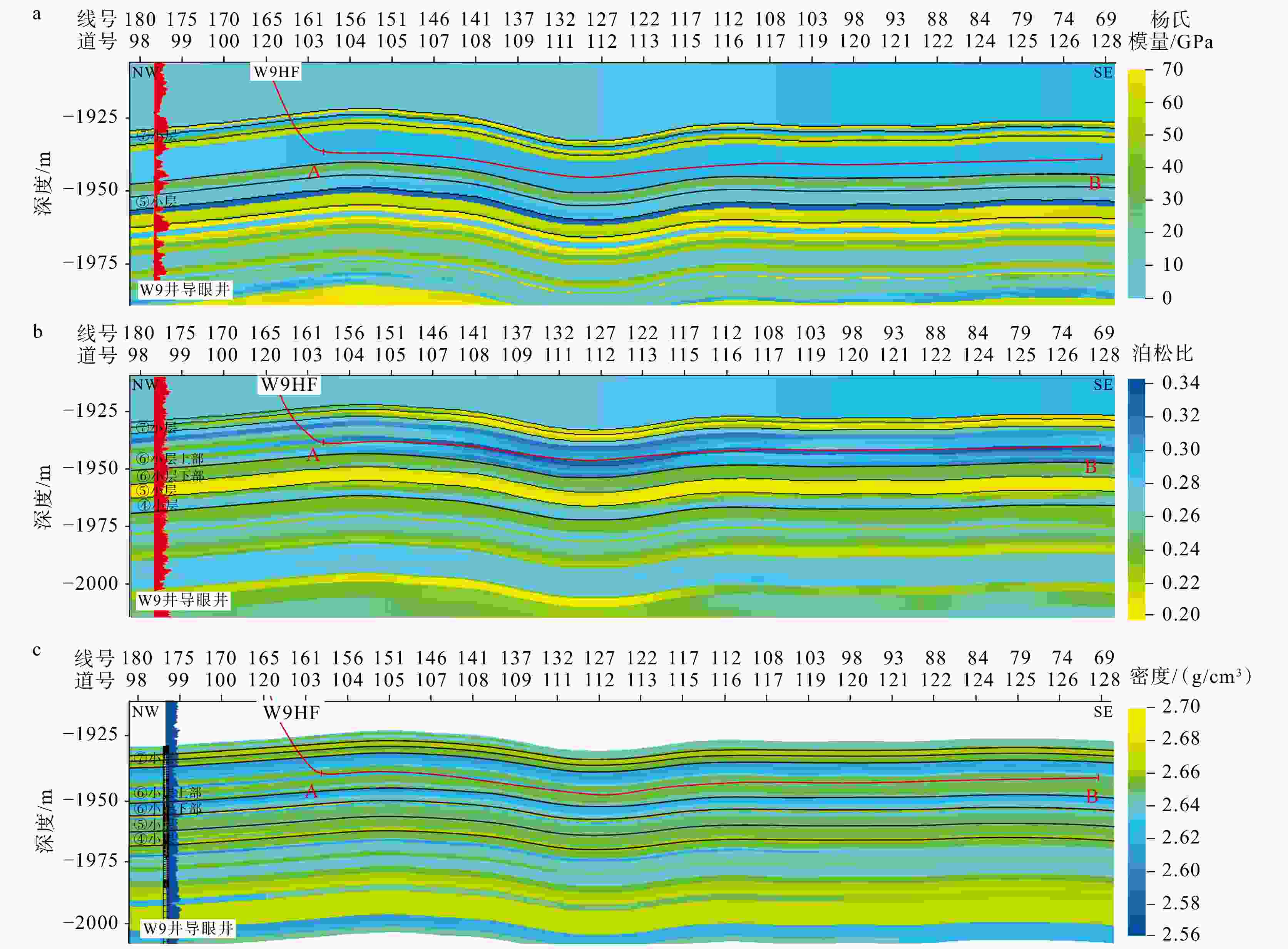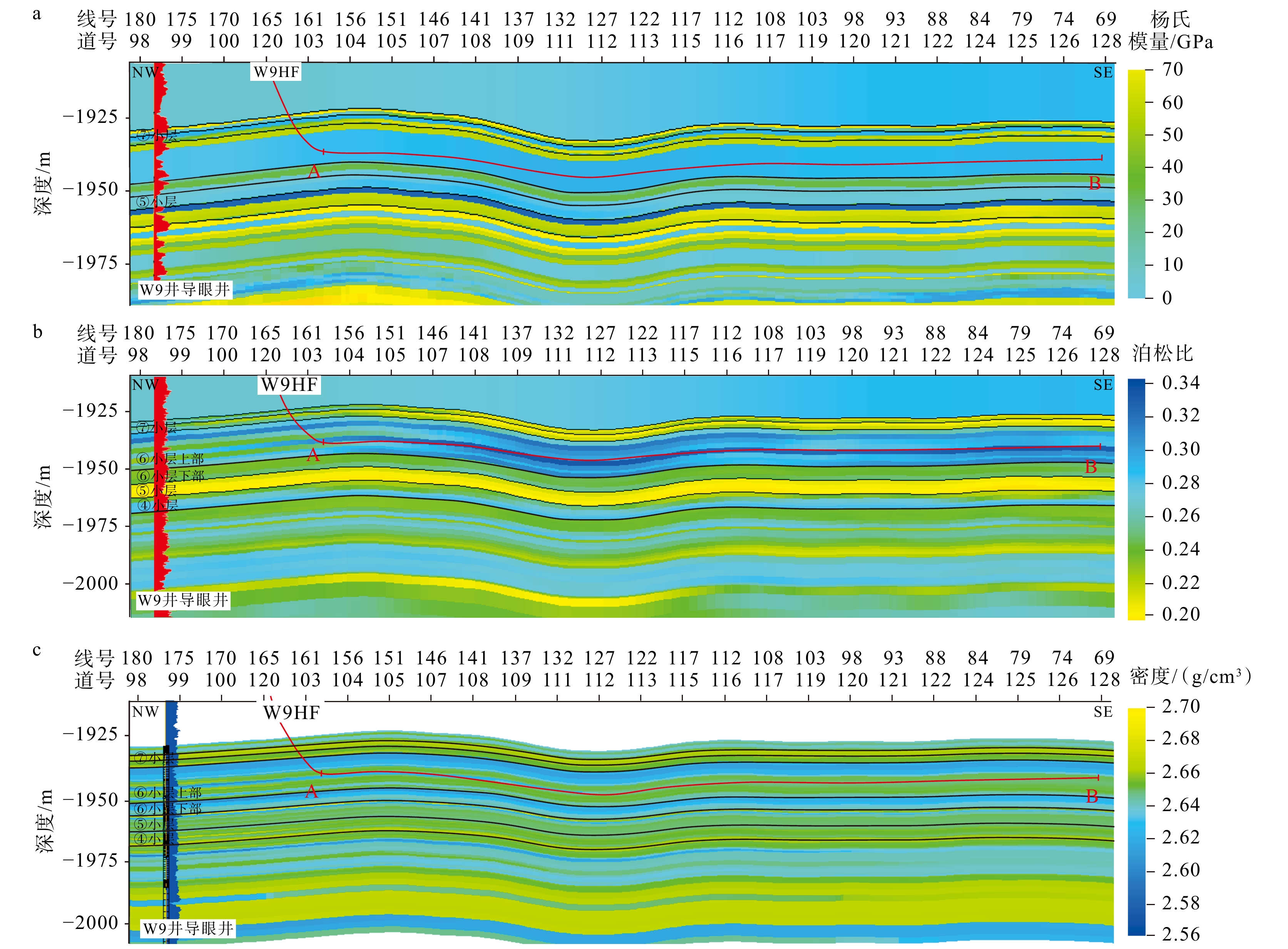 层间黑线为小层底界线;A、B为水平井A、B靶点;线号、道号间隔为20 ma—杨氏模量;b—泊松比;c—密度