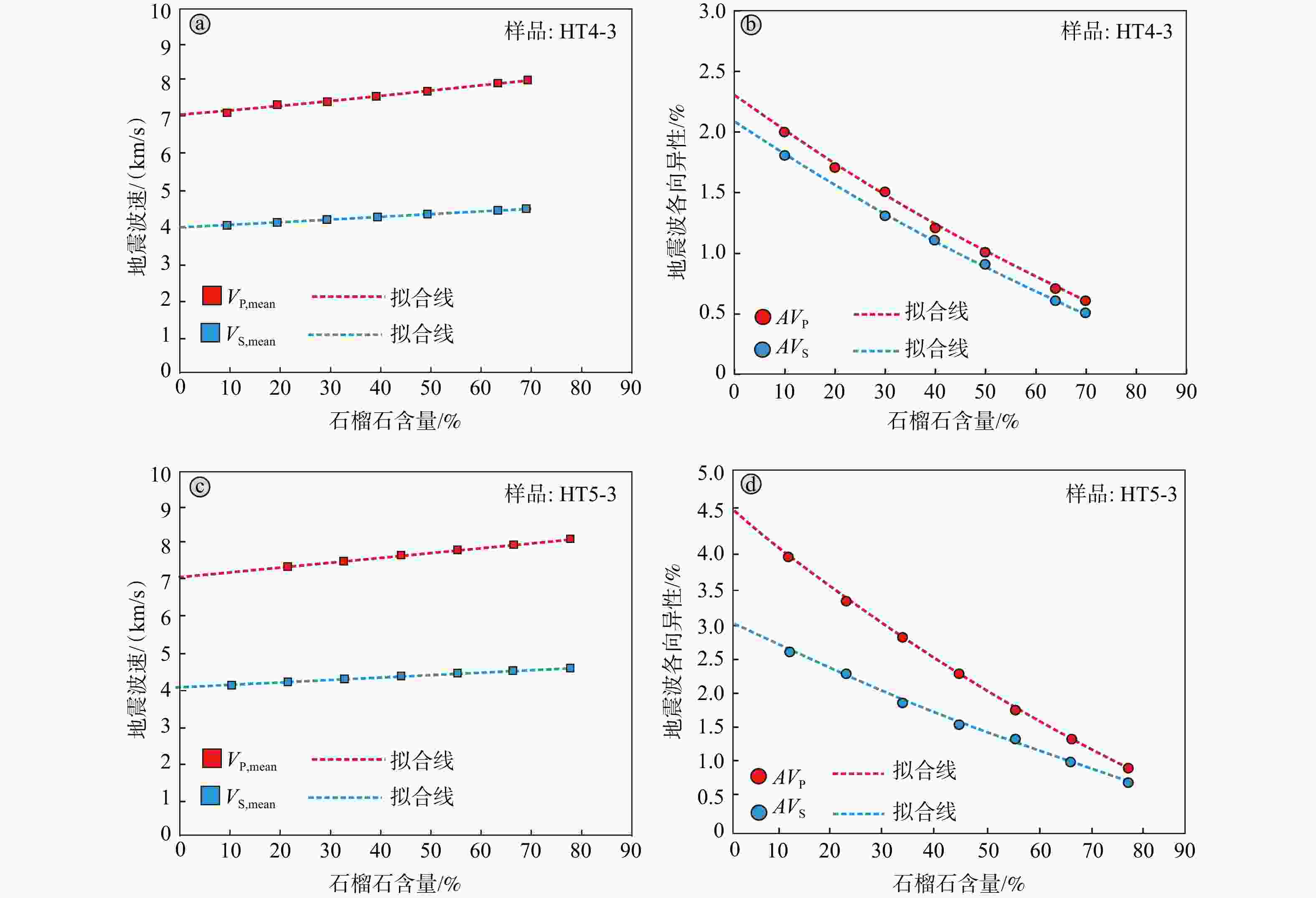 a、b—石榴辉石岩(样品HT4-3)地震波速性质和石榴石含量关系图谱;c、d—石榴辉石岩(样品HT5-3)地震波速性质和石榴石含量关系图谱