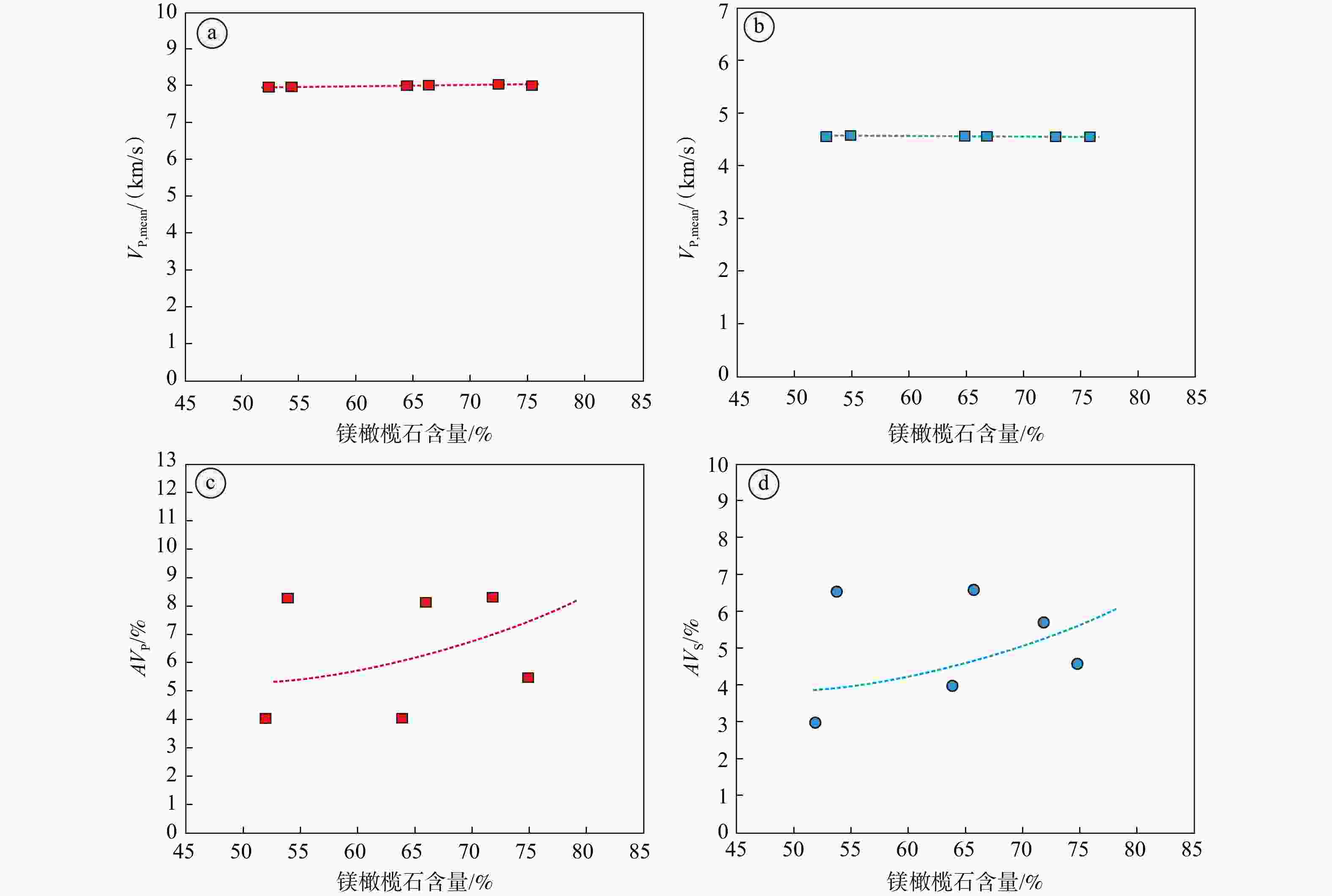 a、b—尖晶石二辉橄榄岩全岩地震波波速与橄榄石含量关系;c、d—尖晶石二辉橄榄岩全岩地震波各向异性与橄榄石含量关系