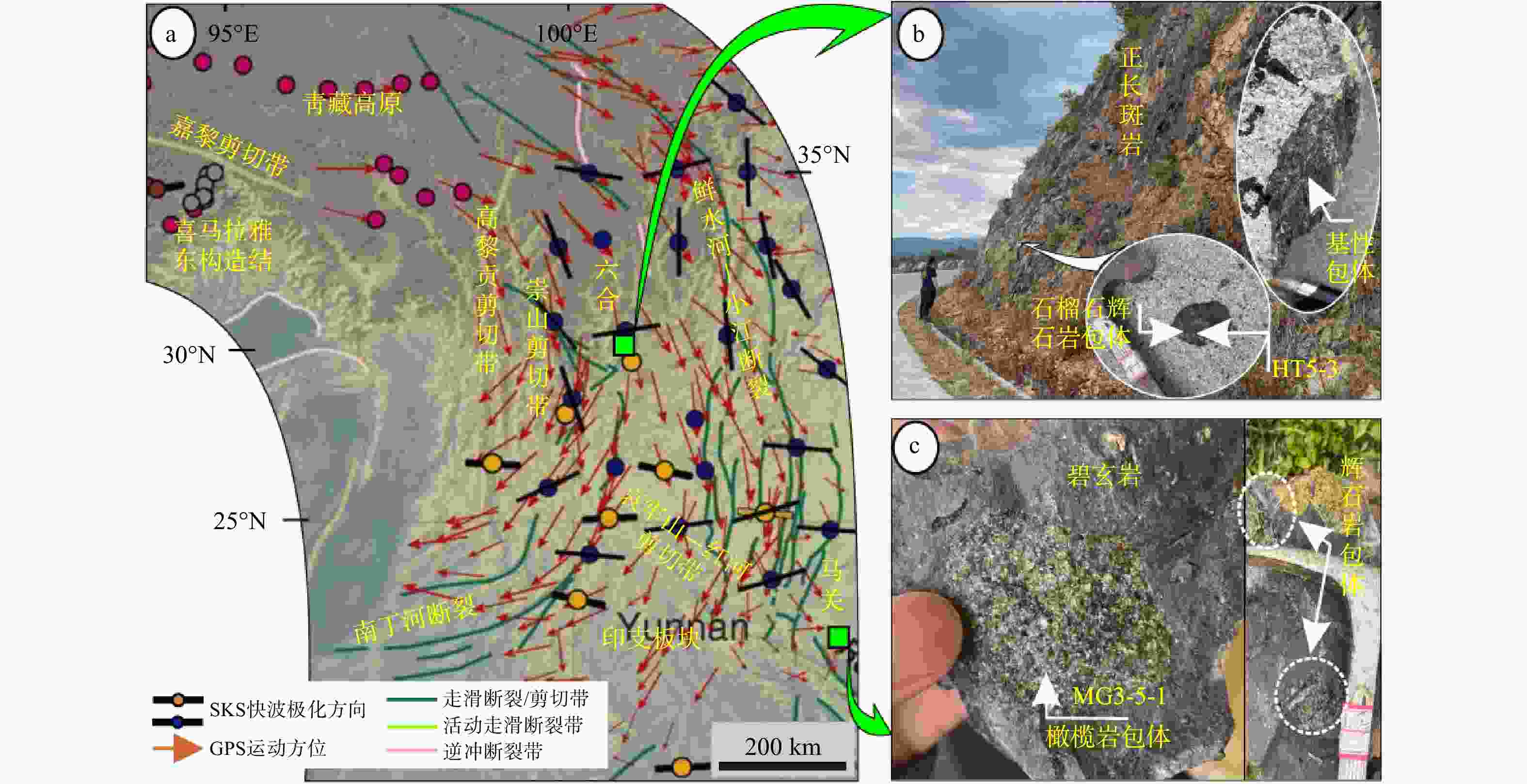 a—喜马拉雅东构造结及东南缘构造地貌、GPS(Zhang et al.,2004)及SKS快波极化方位信息(Lev et al.,2006);b—六合地区正长斑岩中的石榴石辉石岩和基性包体;c—马关地区碧玄岩中的辉石岩包体和橄榄岩包体