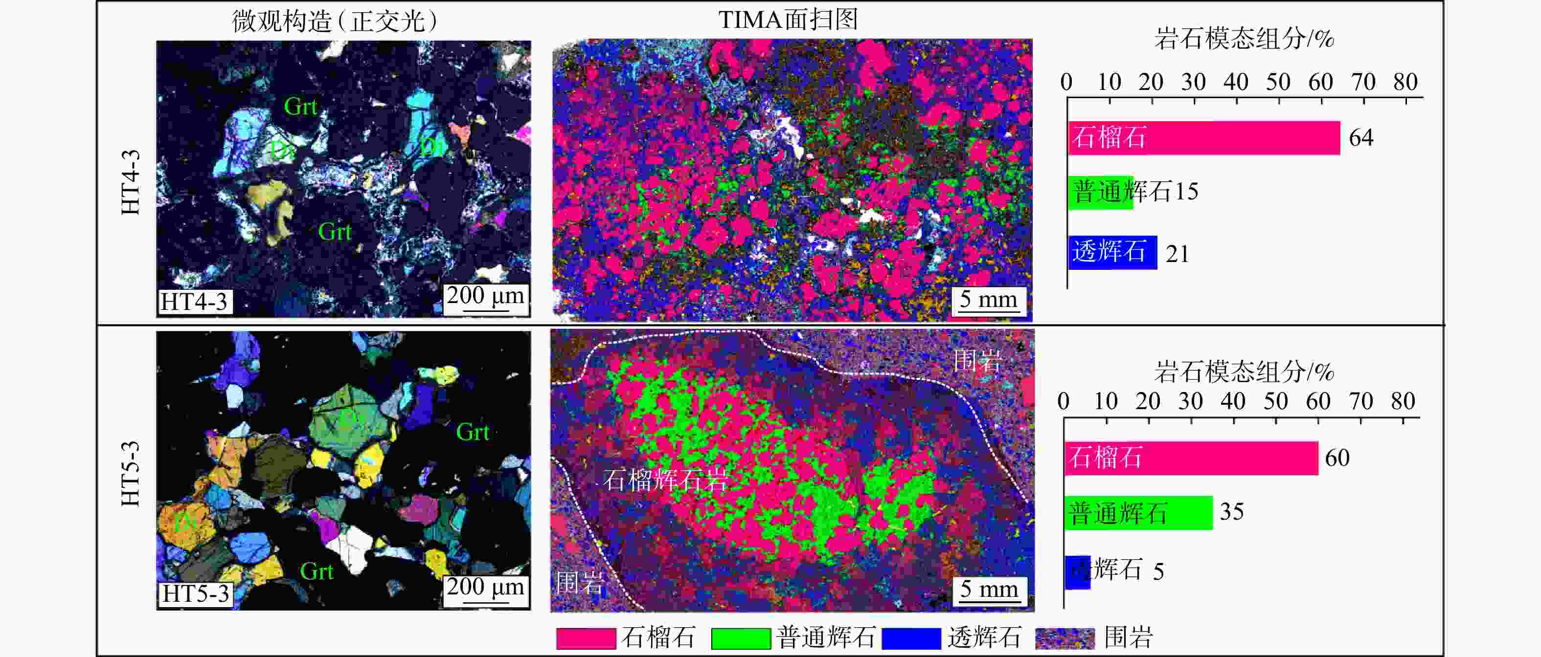 图  3  高原东南缘六合地区石榴辉石岩包体样品(HT4-3和HT5-3)微观构造、矿物相组合及岩石模态组分(采样位置见图2a和表1)