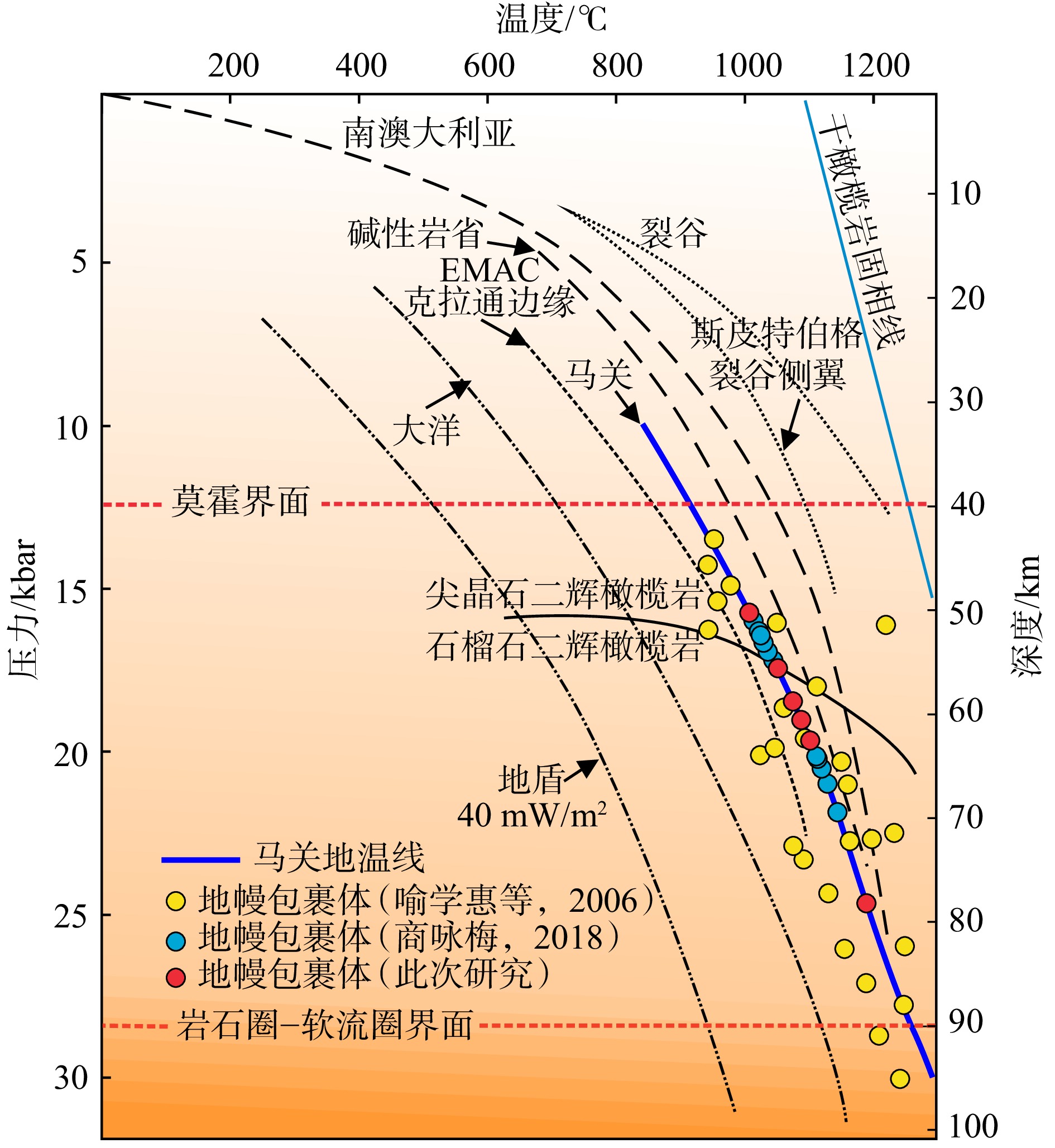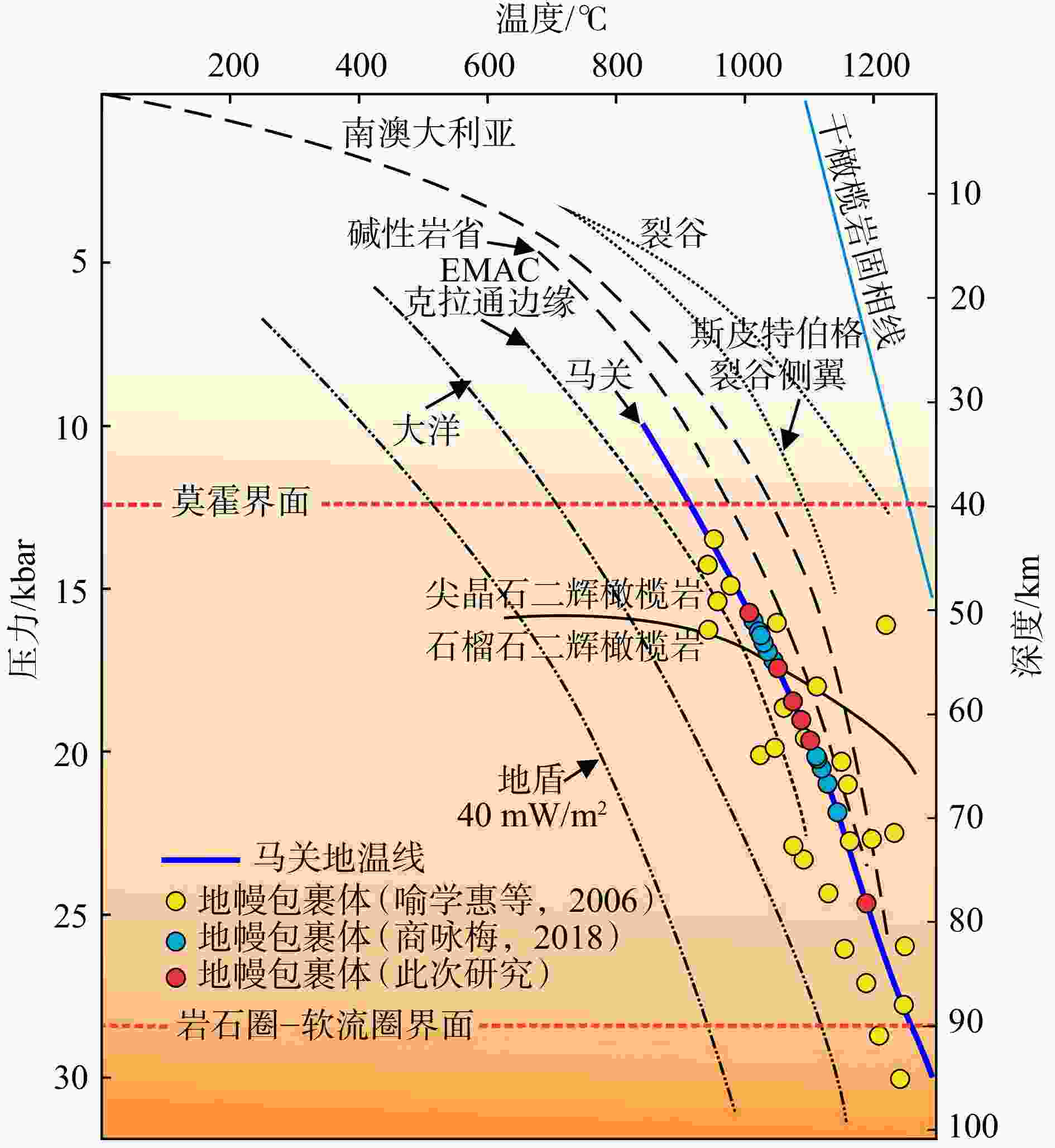 莫霍界面和岩石圈−软流圈(LAB)界面深度来自Yang et al.,2017;Hu et al.,2018