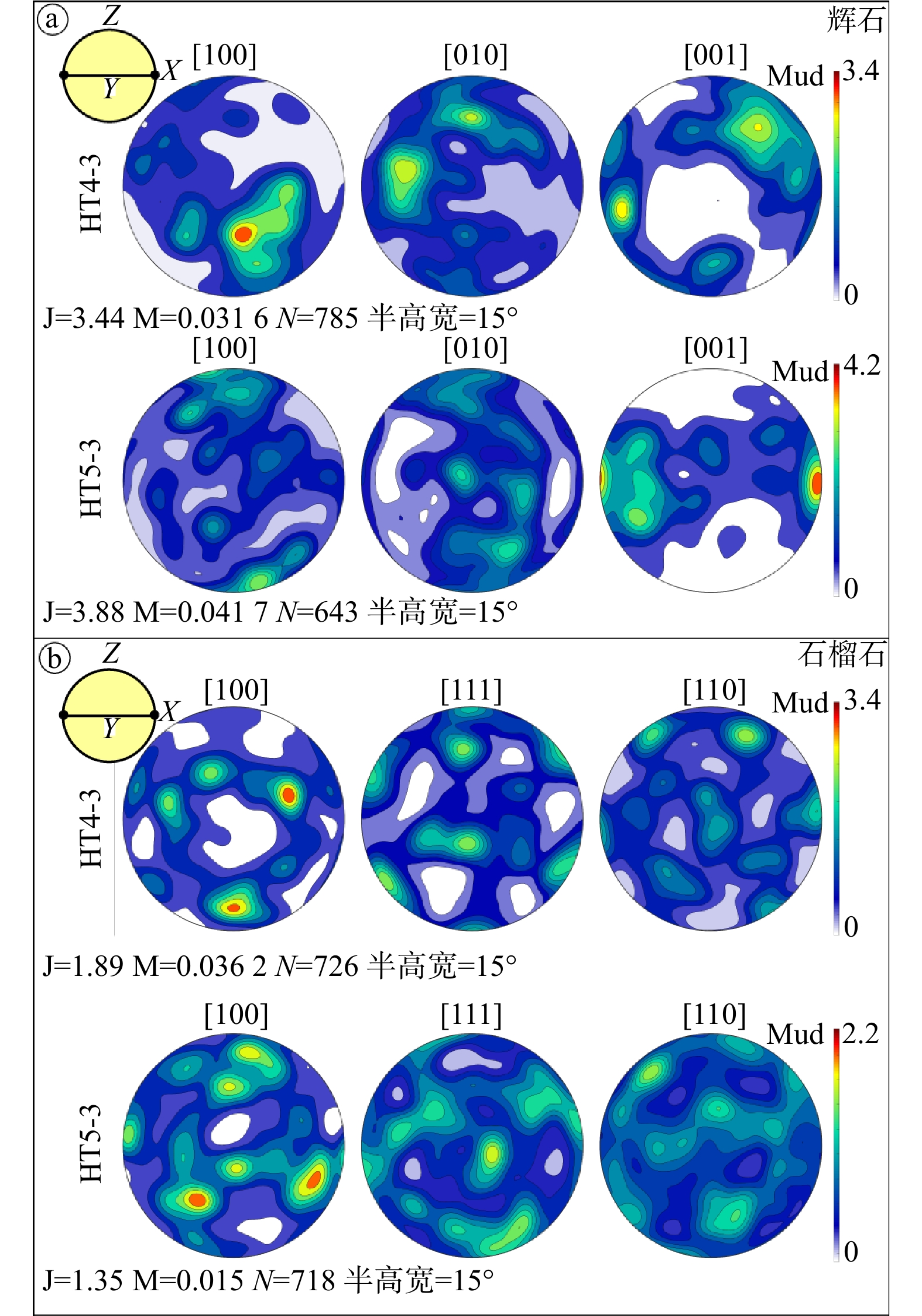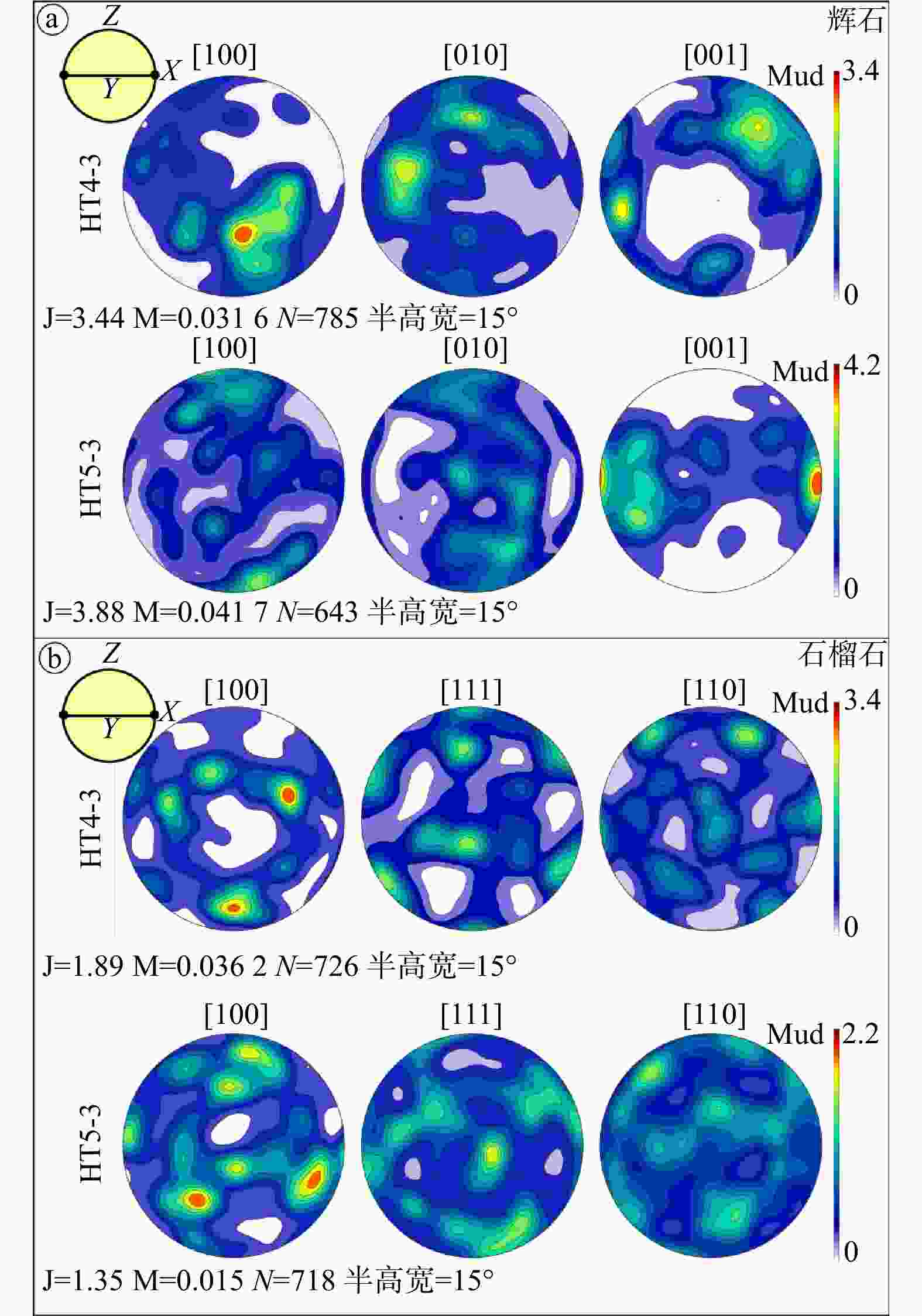 组构模式显示方式为等面积下半球投影,坐标框架见左上方,N为测量点数,J和M为组构强度指数a—样品HT4-3和HT5-3中辉石的组构模式;b—样品HT4-3和HT5-3中石榴石的组构模式
