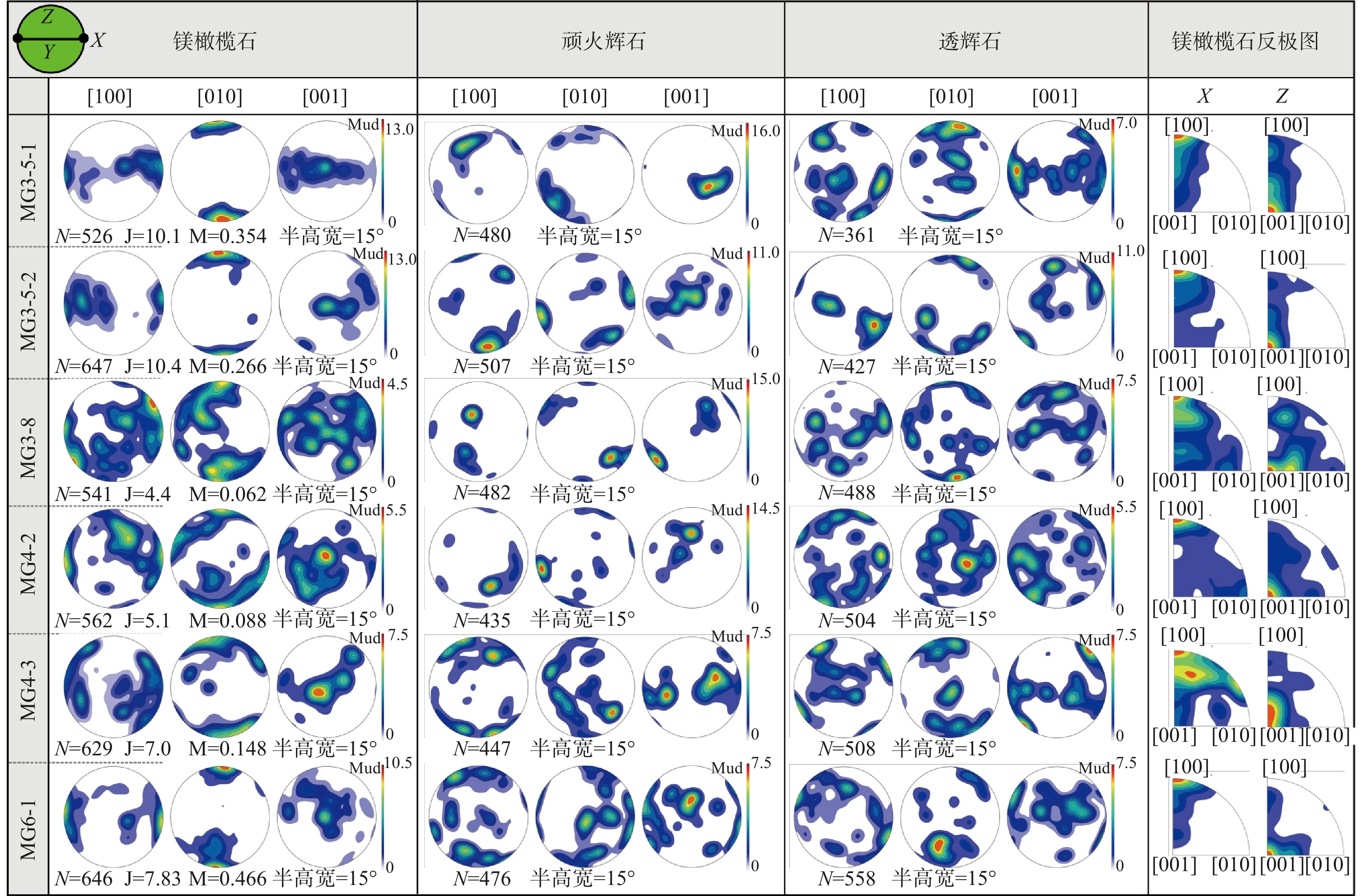 CPOs显示方式为等面积下半球投影,所有矿物CPOs极图均以橄榄石[100]轴和[010]轴平行于线理和面理法线为参考进行旋转,最右侧是橄榄石反极图,坐标框架在左上方显示;N是测量点数,J和M是组构强度指数