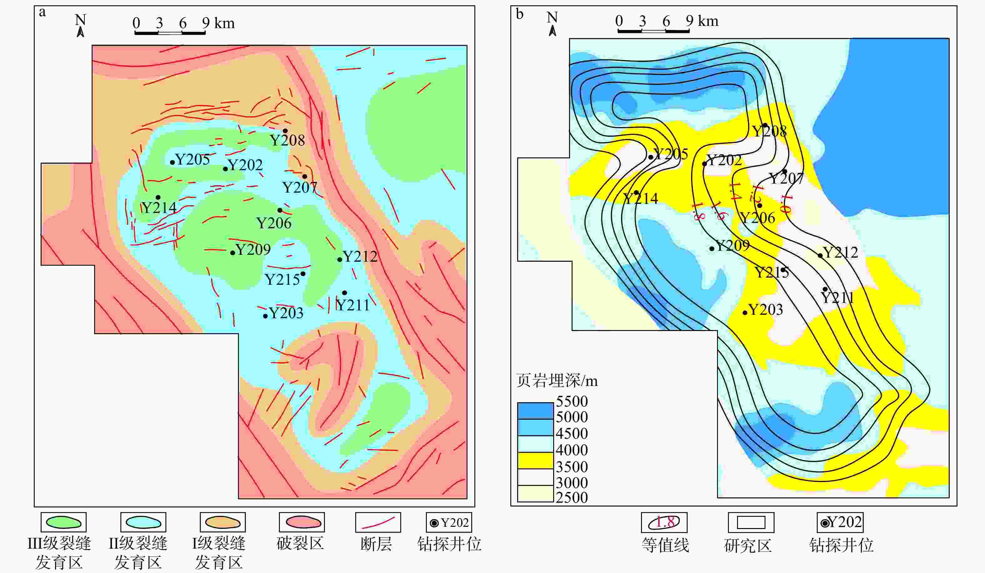 a—天宫堂地区裂缝发育分级;b—龙一段1亚段埋深及压力系数分布平面图