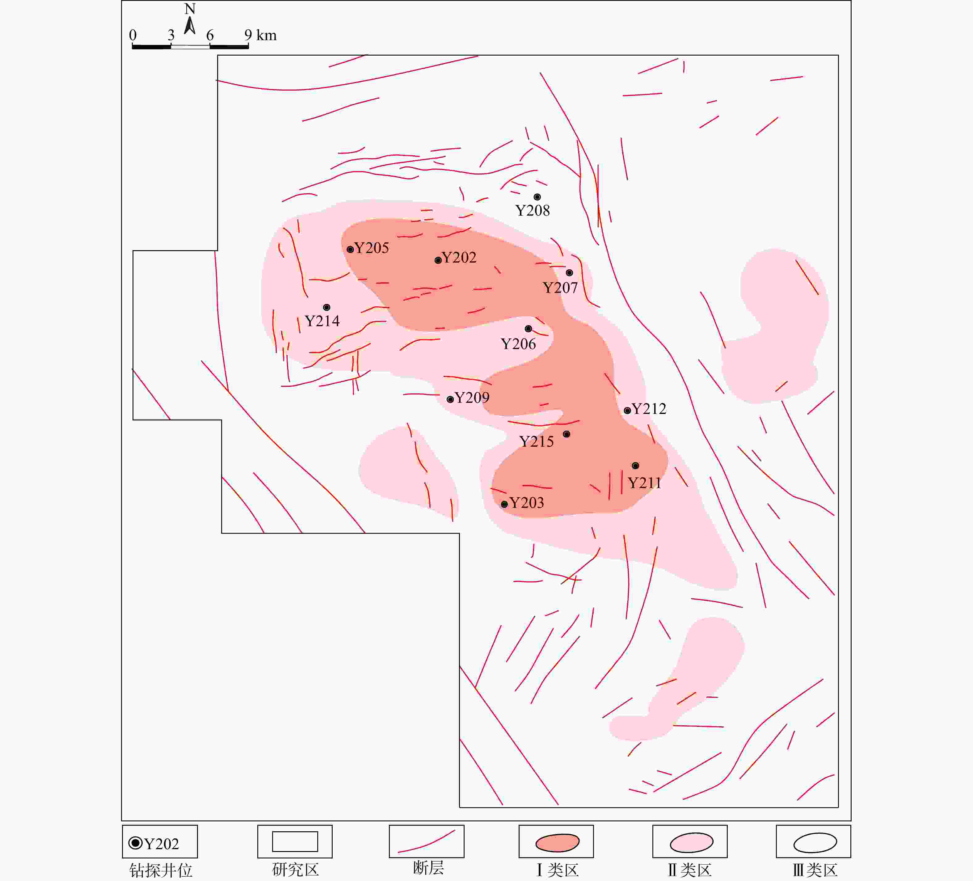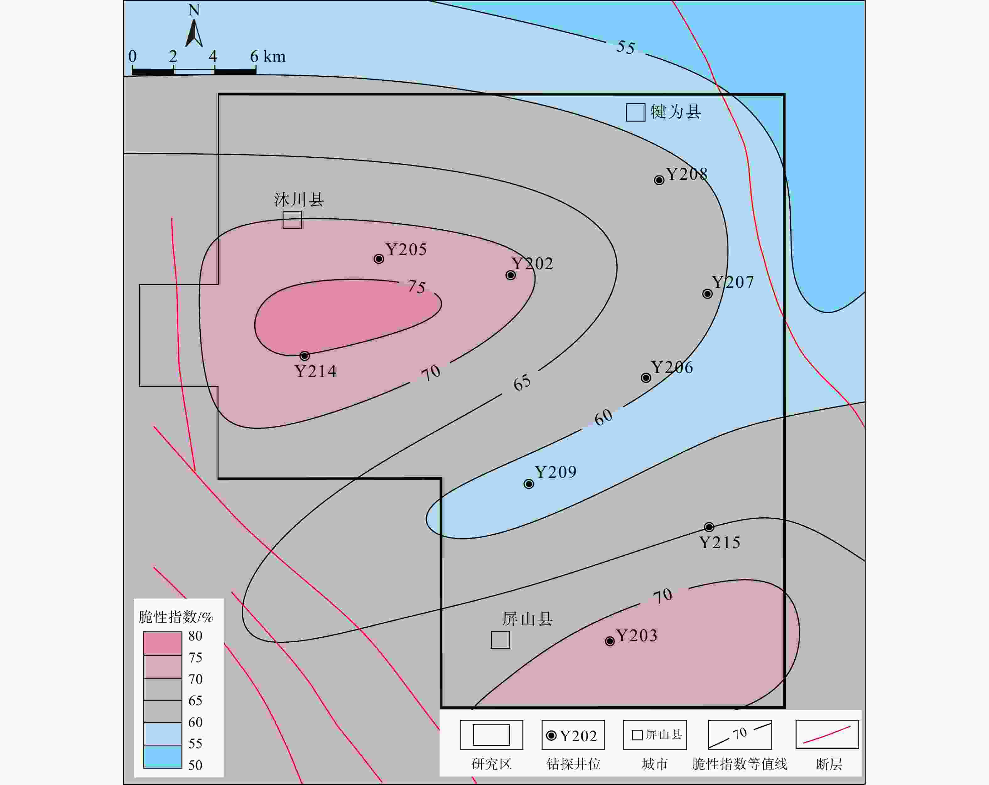 参数类型 参数名称 优选指标 Ⅰ类区(好) Ⅱ类区(较好) Ⅲ类区(差) 源储条件 TOC含量/% >2.4 2.0~2.4 <2.0 脆性指数/% >65 55~65 45~55 孔隙度/% >4.5 4.0~4.5 2.0~4.0 优质页岩厚度/m >35 30~35 <30 保存条件 构造样式 宽缓背斜部位 斜坡部位 高陡背斜+大尺度断裂或向斜部位 断层级别 Ⅲ、Ⅳ级 Ⅱ级 Ⅰ级 裂缝发育程度 Ⅱ级裂缝发育区 Ⅲ级裂缝发育区 Ⅰ级裂缝发育区、裂缝欠发育区 距断裂距离 >6 3~6 <3 页岩埋深/m 3000~4000 2500~3500 >4000或<2500 地层压力系数 >1.4 1.4~1.2 <1.2 -
