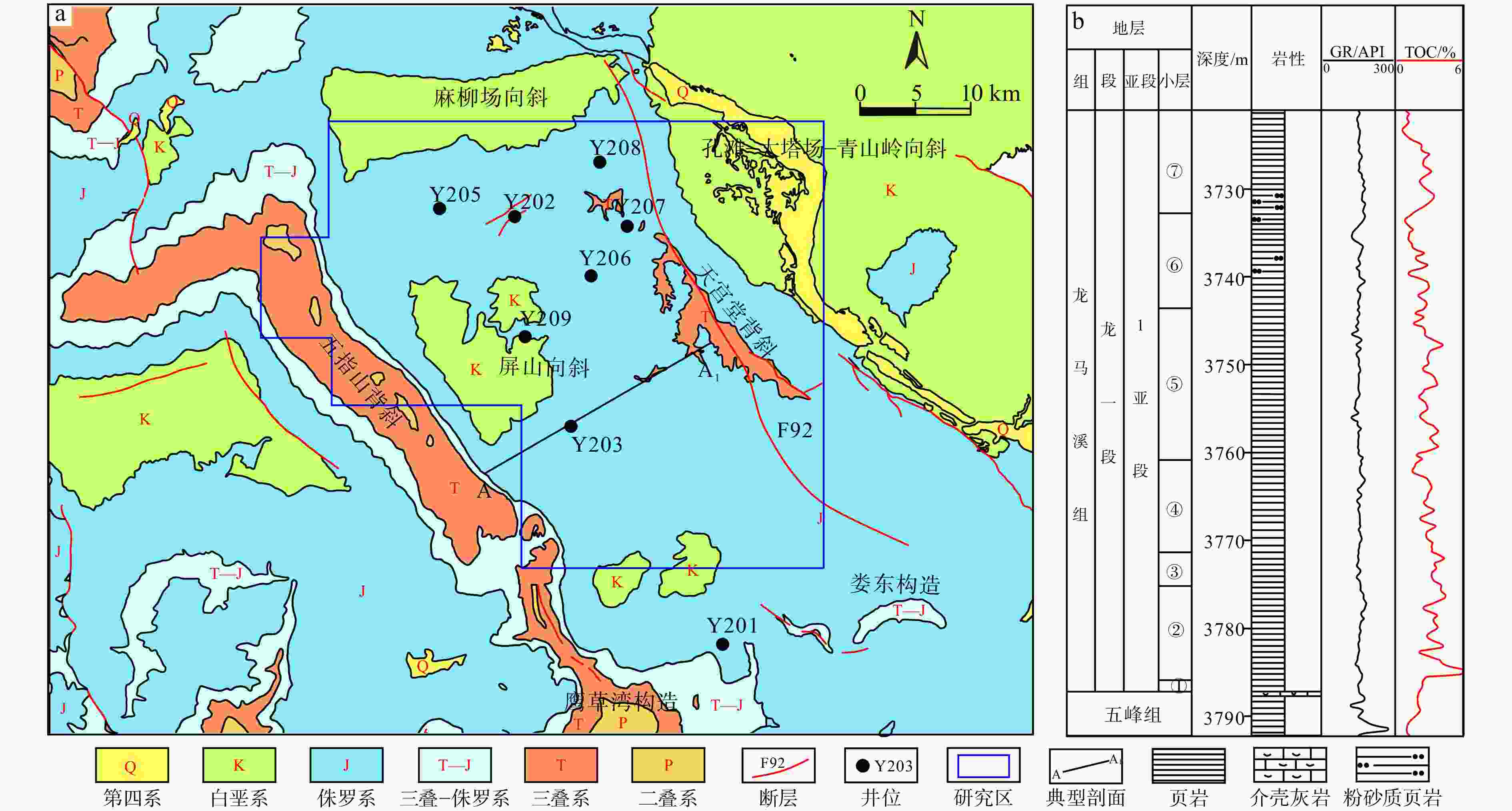 GR—自然伽马,TOC—总有机碳含量a—天宫堂地区构造地质图;b—典型井龙一段1亚段地层柱状图