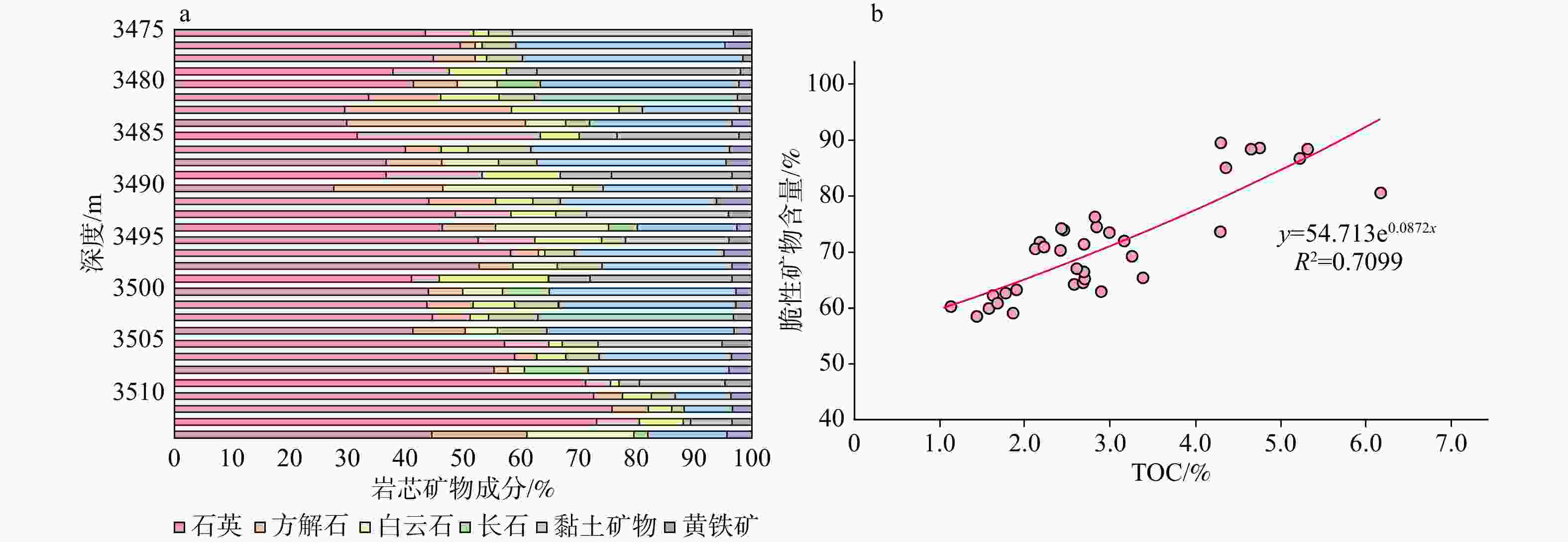 a—Y202井龙一段1亚段全岩矿物组分含量;b—龙一段1亚段TOC含量与脆性矿物含量相关图(其中y代表脆性矿物含量,x代表TOC,R2代表决定系数)