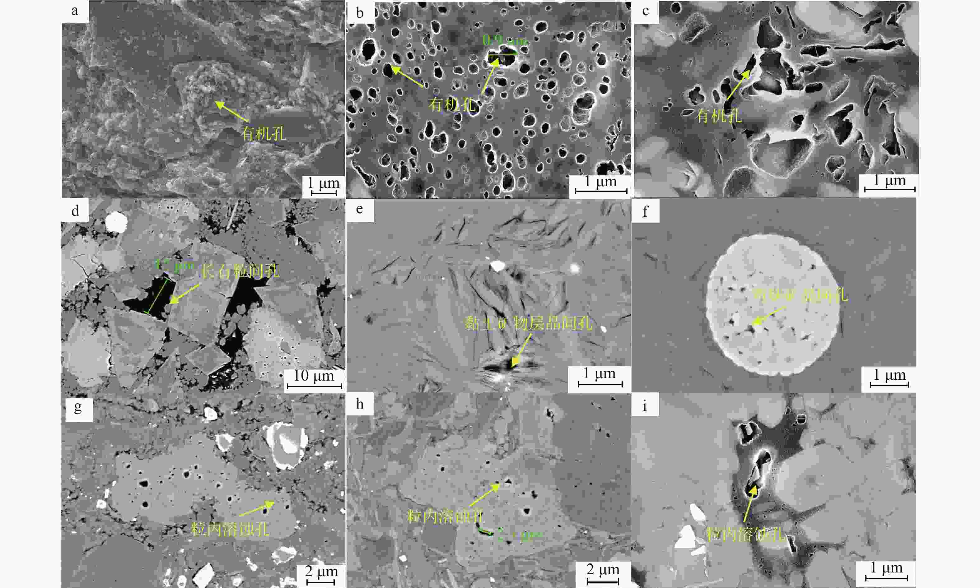 a—Y203井,3777.7 m,有机孔发育;b—Y206井,3874.2 m,椭圆状有机孔发育;c—Y206井,③小层,有机孔溶蚀发育;dY206井,3887.5 m,长石粒间孔发育;e—Y206井,3886.6 m,黏土矿物层间晶间孔发育;f—Y206井,3887.6 m,黄铁矿晶间孔发育;g—Y206井,④小层,粒间溶蚀孔发育;h—Y206井,3887.1 m,粒内溶蚀孔;i—Y206井,②小层,粒内溶蚀孔发育