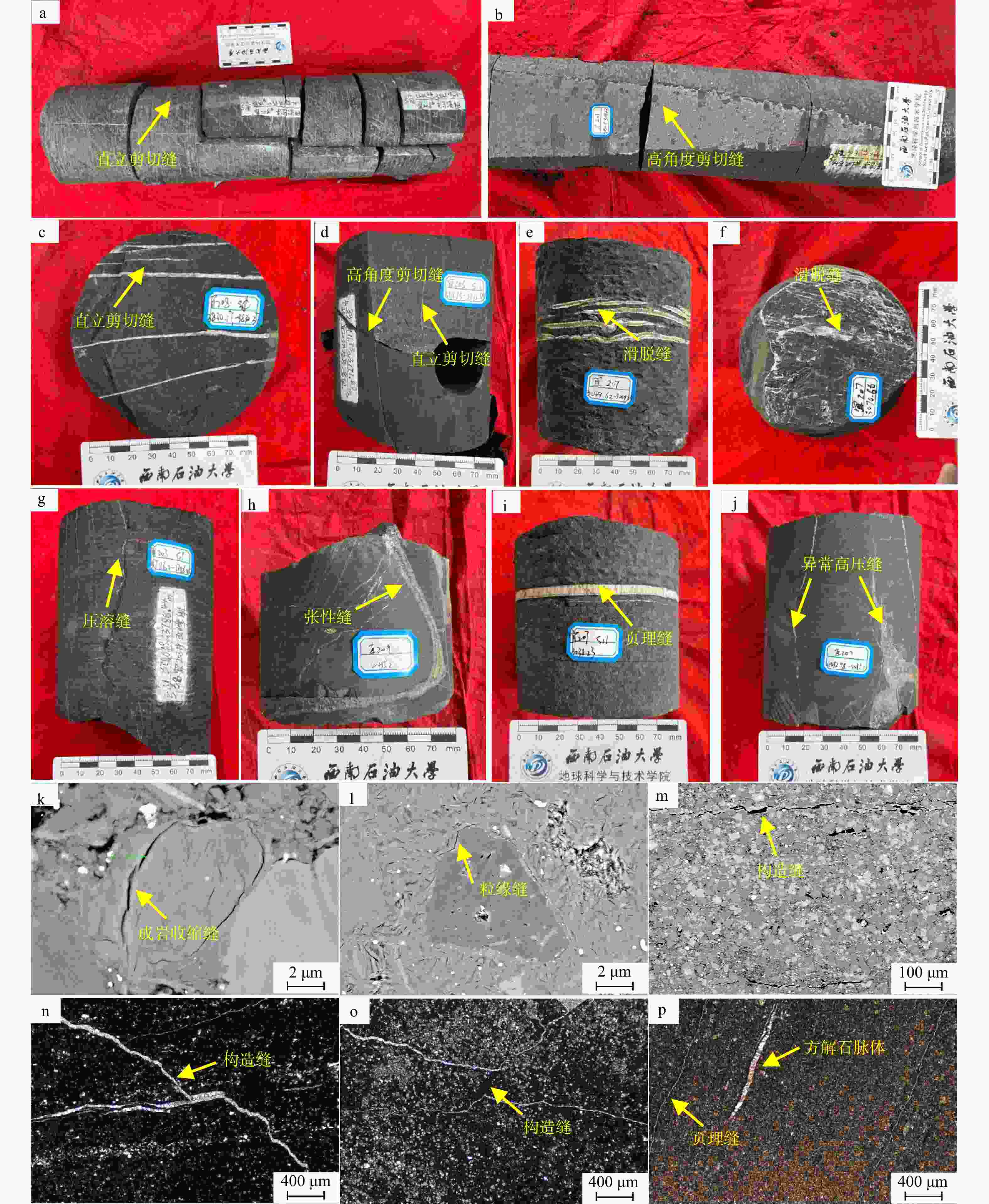 a—Y208井,3830.88 m,直立剪切缝;b—Y207井,3830.81m,高角度剪切缝;c— Y208井,3830.17m,多条直立剪切缝;d—Y203井,3771.73m,直立剪切缝与高角度剪切缝相交;e—Y207井,3049.63m,滑脱缝;f—Y207井,3070.66m,滑脱缝;g—Y203井,3786.00m,压溶缝;h—Y209井,4453.2m,张性缝;i—Y207井,3038.23m,页理缝;j—Y209井,4452.98m,异常高压缝;k—Y206井,龙一段1亚段③小层,成岩收缩缝;l—Y206井,龙一段1亚段①小层,粒缘缝;m—Y206井,龙一段1亚段①小层,构造缝;n— Y207井,3049.62m,构造缝;o—Y207井,3069.69m,构造缝;p—Y207井,3049.62m,页理缝、方解石脉体