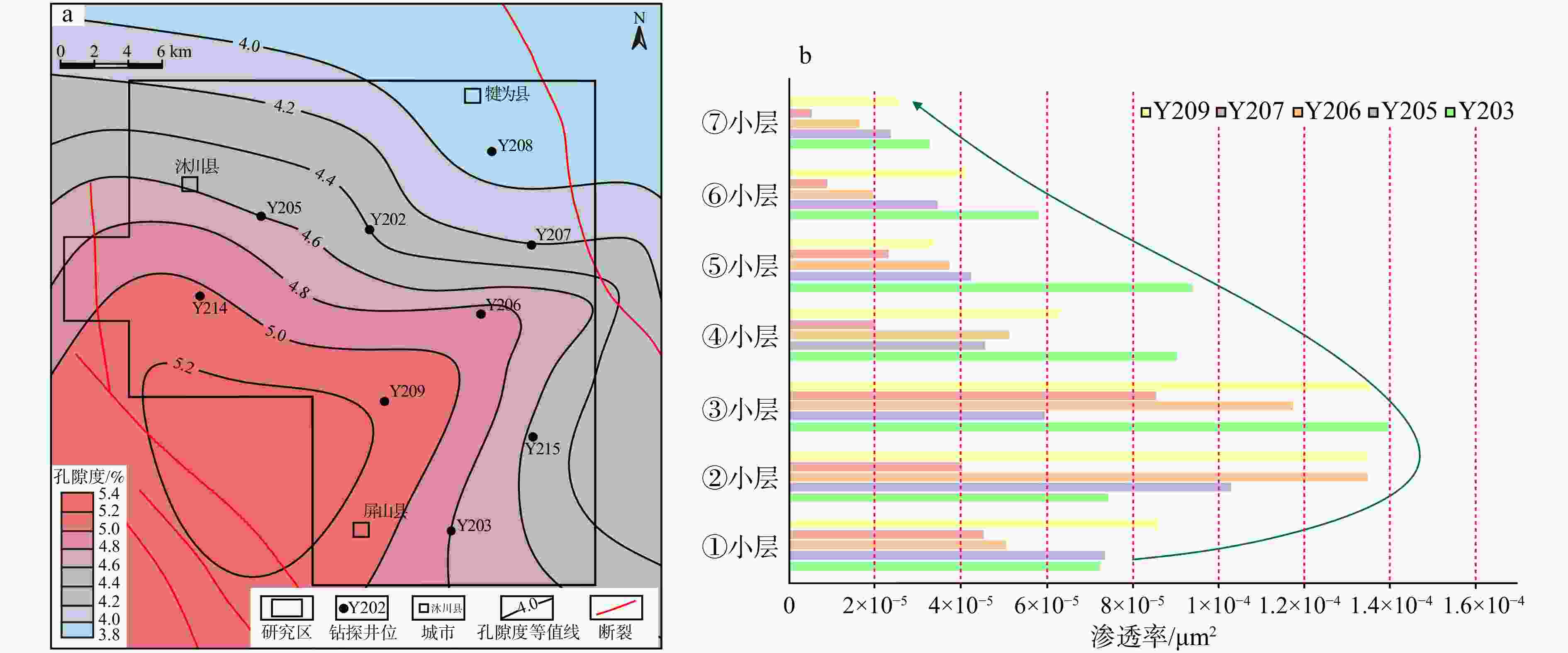 a—天宫堂地区龙一段1亚段孔隙度平面等值线图;b—天宫堂地区典型井龙一段1亚段渗透率柱状图