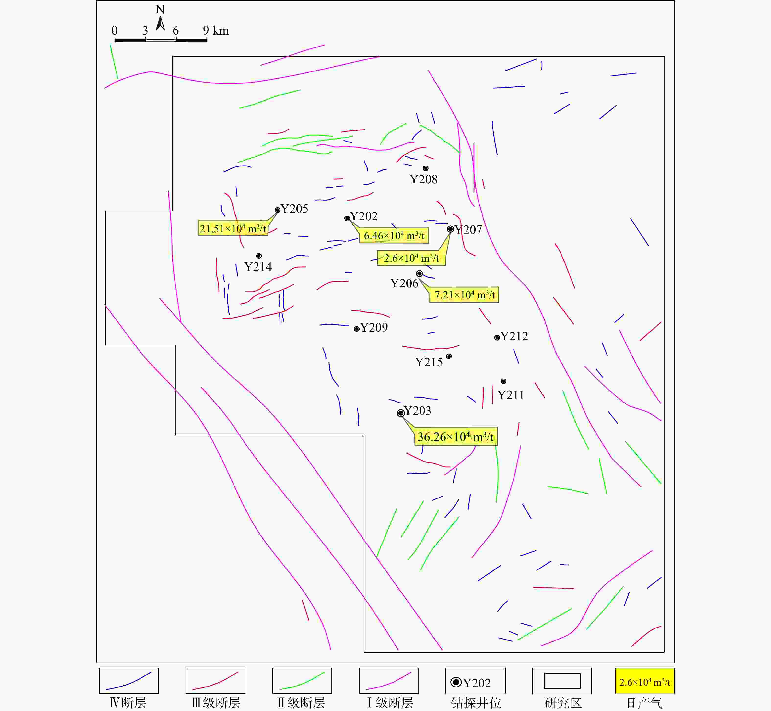 摘要: 川西南天宫堂地区龙马溪组一段页岩气储层具有显著的非均质性特征。为了探明影响川西南页岩气富集条件的因素,文章基于钻井岩芯、地球化学测试、矿物组分分析及测井资料,综合地质学、地球化学与测井解释等多学科研究方法,系统分析了该区页岩气富集条件及勘探潜力。结果表明,龙一段1亚段发育一套厚度25~60 m的连续稳定富有机质页岩,TOC含量1.0%~4.0%(平均3.19%),纵向上下部龙一段1亚段①~③小层TOC含量显著高于上部层段;Ro值2.58%~3.16%,表明处于过成熟阶段。矿物组成以石英(35%~45%)、黏土矿物(25%~35%)和碳酸盐矿物(15%~25%)为主,脆性指数大于60%,具备良好可压性。储集空间包括有机孔(孔径0.02~0.9 μm)、无机孔(粒内溶蚀孔、粒间孔等)及多尺度裂缝系统(构造缝、非构造缝和微裂缝),孔隙度3.0%~6.0%(平均4.2%),渗透率0.0003~0.2352 mD(2.96×10−7~2.32×10−4 μm2),纵向呈“顶底低渗、中部高渗”特征。构造保存条件分析表明,宽缓背斜和单斜构造区保存条件较好,而高陡断裂带附近气体散失严重;地层压力系数与产量呈正相关,当压力系数>1.4时单井日产量普遍突破20×104 m3/d(如Y203井36.26×104 m3/d)。通过建立综合评价指标体系,将天宫堂地区划分为Ⅰ类(TOC>2.4%、脆性指数>65%、孔隙度>4.5%、优质页岩厚度>35 m、埋深3000~4000 m、压力系数>1.4)和Ⅱ类有利区,为天宫堂地区页岩气勘探开发提供了科学依据。研究成果揭示了复杂构造背景下页岩气富集的主控因素,对川西南地区页岩气高效开发具有指导意义。Abstract: