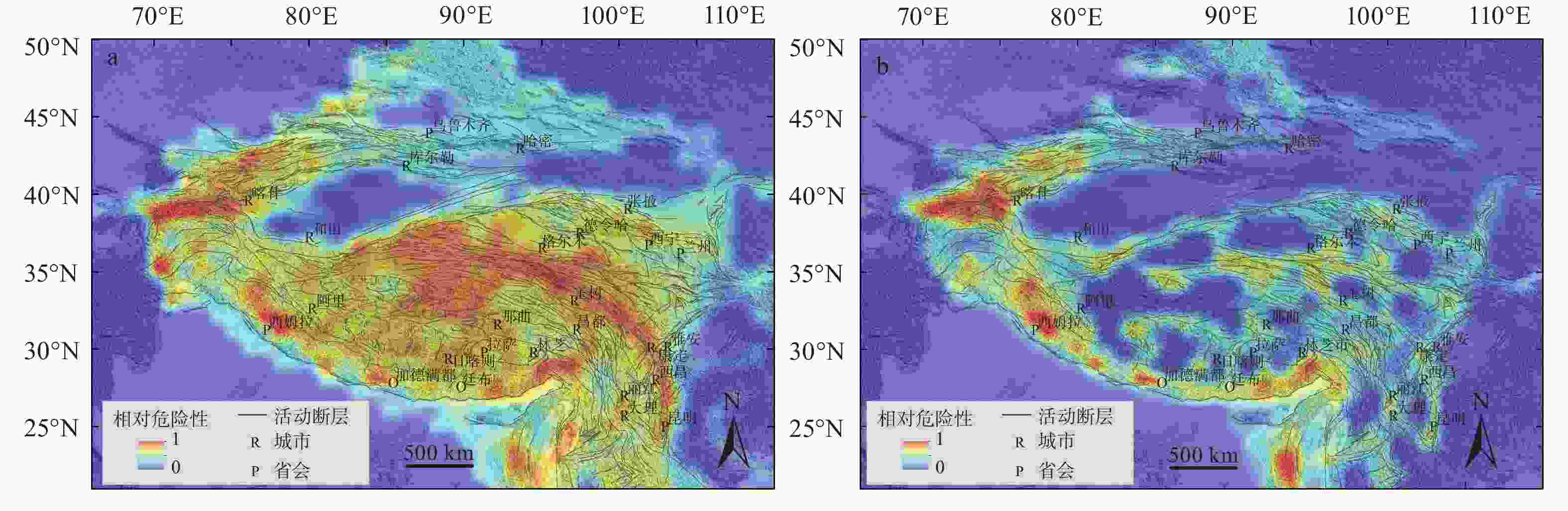 图中灰色细线为断层a—6.5级及以上地震相对危险性;b—7.5级及以上地震相对危险性