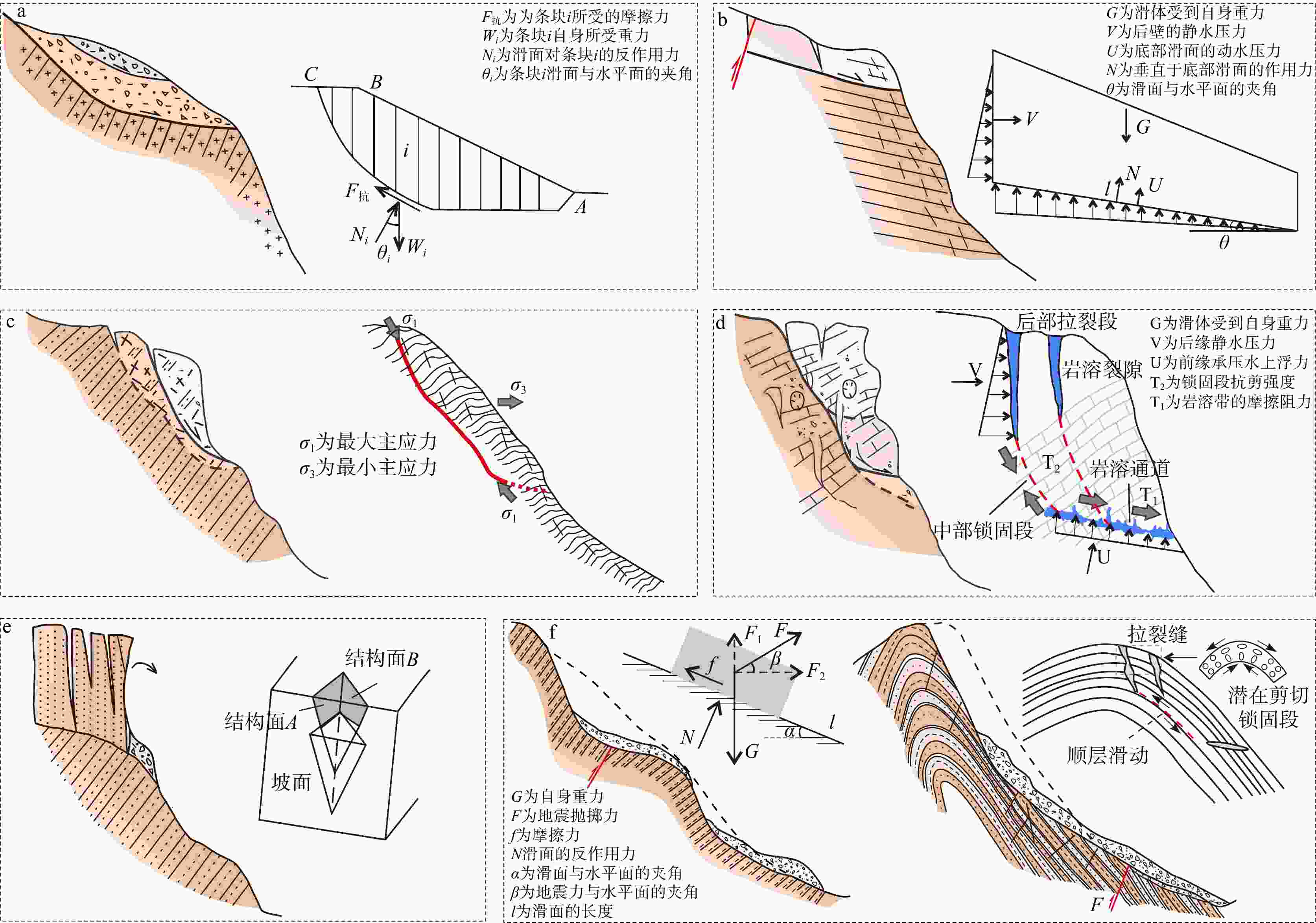 a—堆积体滑移型; b—顺层滑移拉裂型;c—卸荷剪断型;d—岩溶贯通拉裂型;e—崩滑溃散型;f—构造控制型