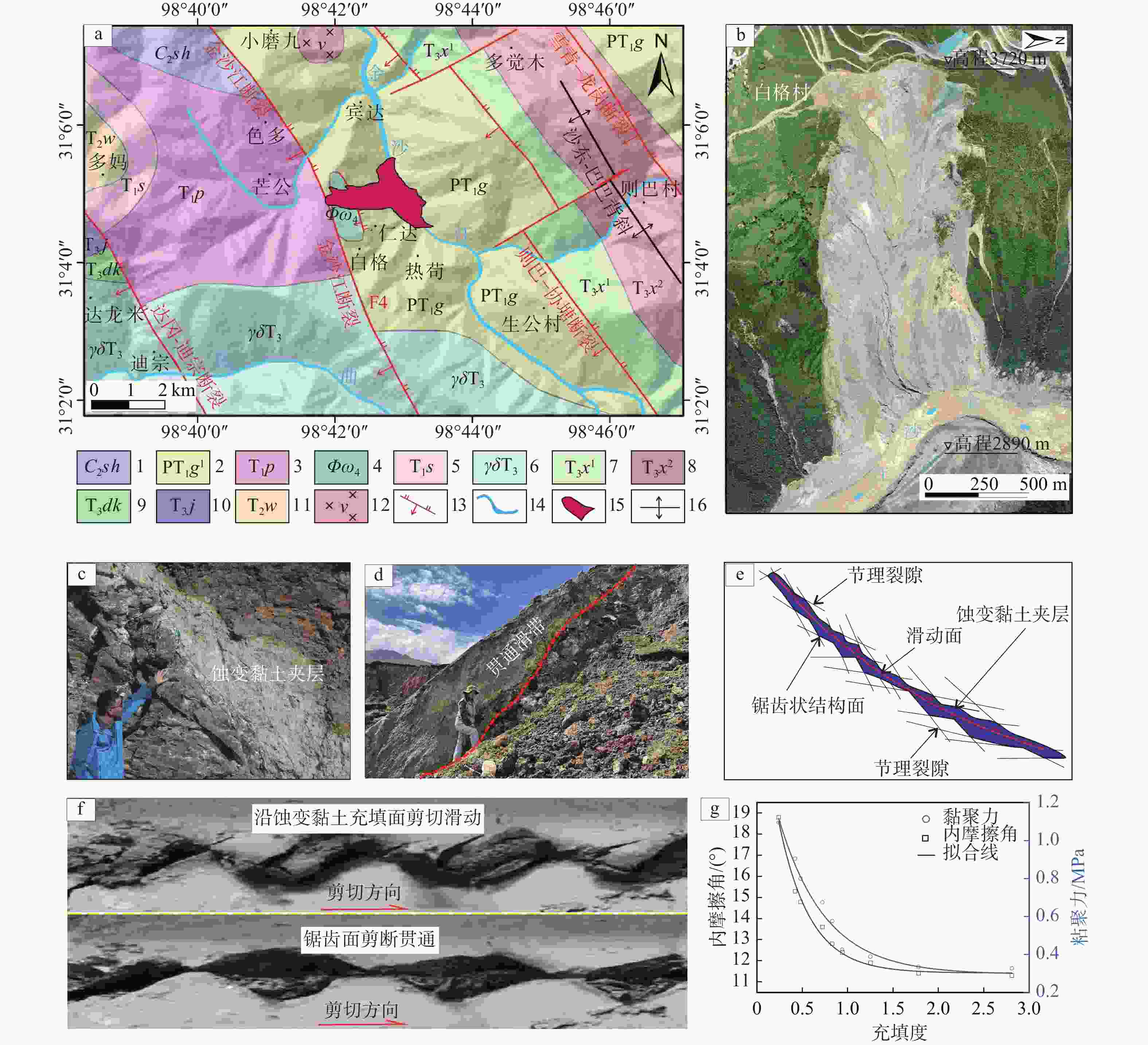 a—白格滑坡所在区域地质构造位置(1—上石炭统生帕群;2—二叠系—三叠系岗托岩组;3—下三叠统普水桥组;4—华力西期金沙江超镁铁质岩带、蛇纹岩;5—下三叠统色容寺组;6—三叠系花岗闪长岩;7—上三叠统下逆松多组下段;8—上三叠统下逆松多组上段;9—上三叠统洞卡组;10—上三叠统甲丕拉组;11—三叠系中统瓦拉寺组;12—三叠系辉长岩岩块;13—逆断裂;14—水系;15—白格滑坡;16—背斜); b—白格滑坡影像;c—充填蚀变黏土结构面野外特征;d—蚀变黏土结构面贯通形成滑带;e—结构面贯通示意图;f—含蚀变黏土夹层结构面循环剪切试验剪切破坏过程;g—蚀变黏土充填结构面抗剪强度参数与充填度关系曲线
