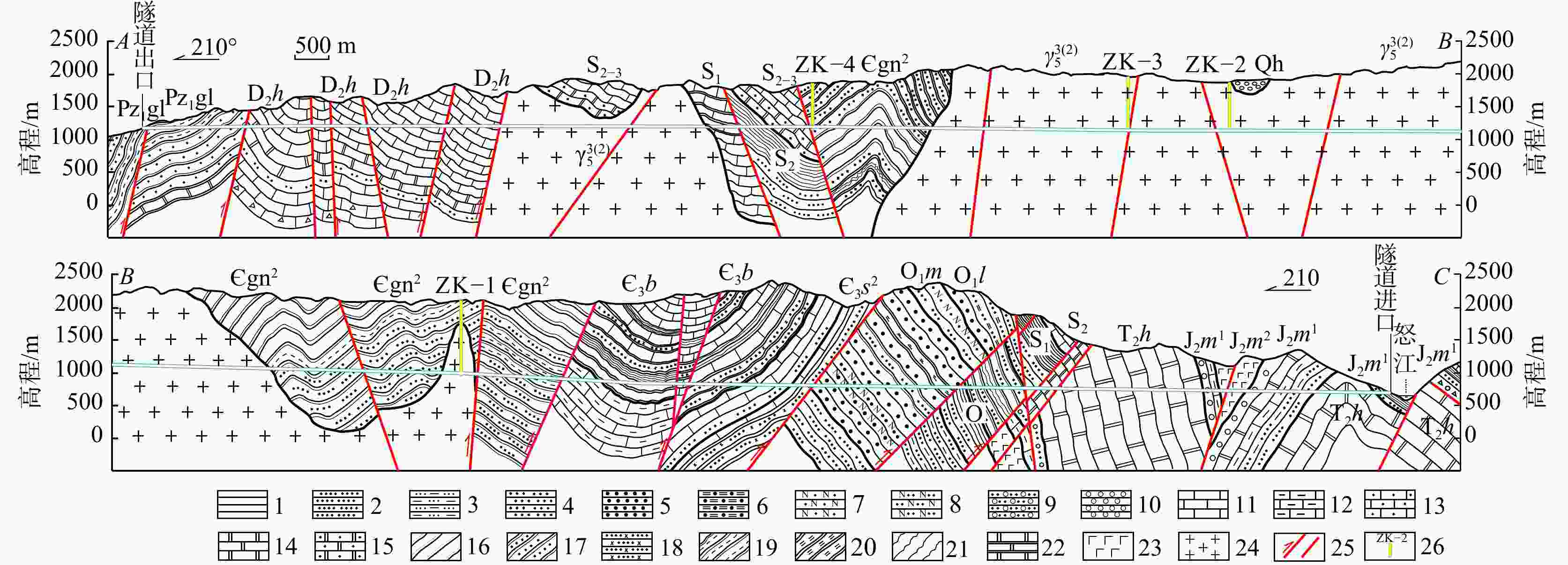 图 8 高黎贡隧道区工程地质剖面图(AB段和BC段)