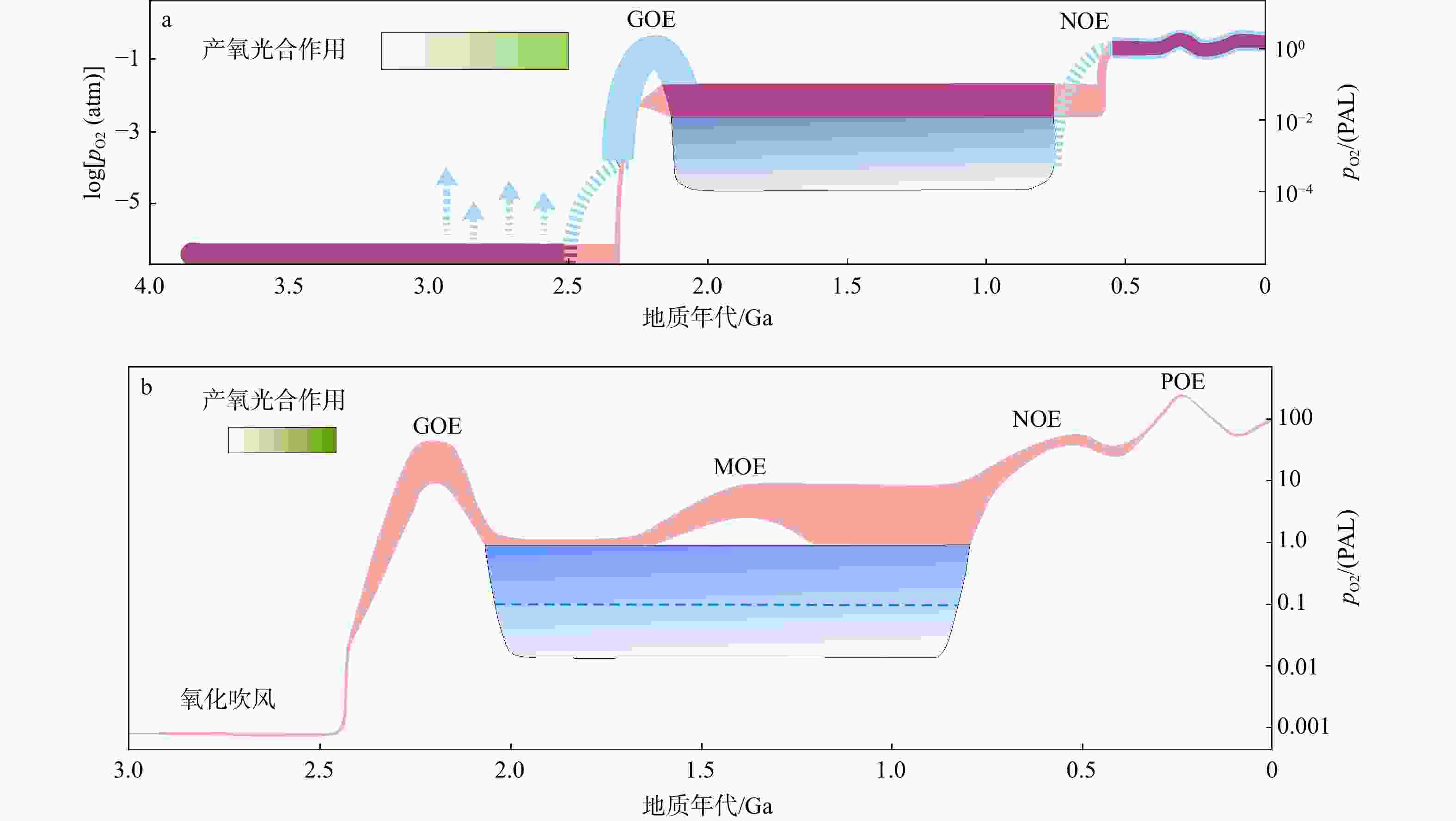$p_{{\mathrm{O}}_2} $—大气氧分压;atm—标准大气压;PAL—现代大气氧含量水平;GOE—大氧化事件;MOE—中元古代氧化事件;NOE—新元古代氧化事件;POE—古生代氧化事件a—传统的二阶段大气增氧模式曲线(据Lyons et al.,2014修改);b—修正的多阶段大气增氧模式曲线(据张水昌等,2022修改)