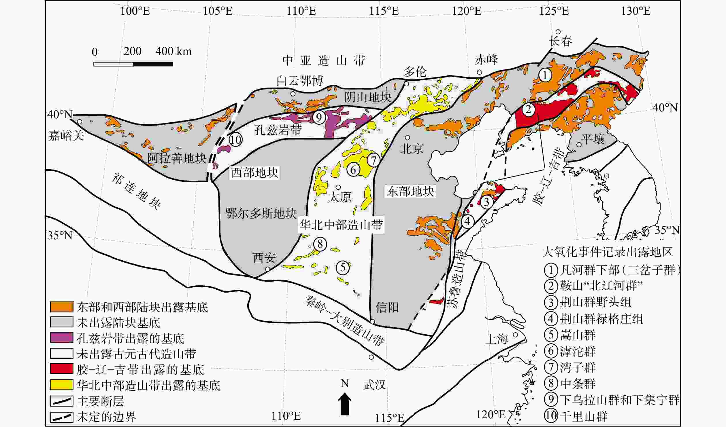 图 3 华北克拉通前寒武纪构造单元划分及古元古代大氧化事件沉积记录分布地区示意图(据王宏宇等,2024修改;底图据Zhao et al.,2012)