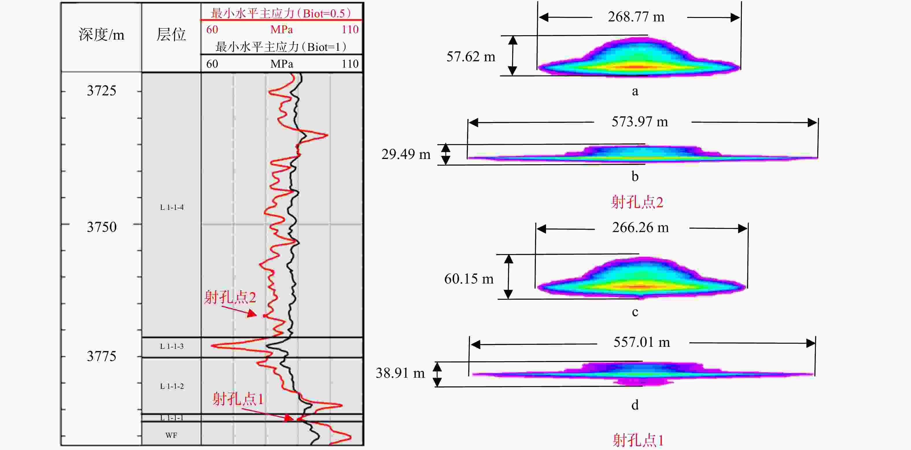 射孔点1测深:3786.5 m;射孔点2测深:3767 mL 1-1-4—龙一段1亚段4小层;L 1-1-3—龙一段1亚段3小层;L 1-1-2—龙一段1亚段2小层;L 1-1-1—龙一段1亚段1小层;WF—五峰组 a—射孔点2,Biot=1条件下裂缝扩展;b—射孔点2,Biot=0.5条件下裂缝扩展;c—射孔点1,Biot=1条件下裂缝扩展;d—射孔点1,Biot=0.5条件下裂缝扩展