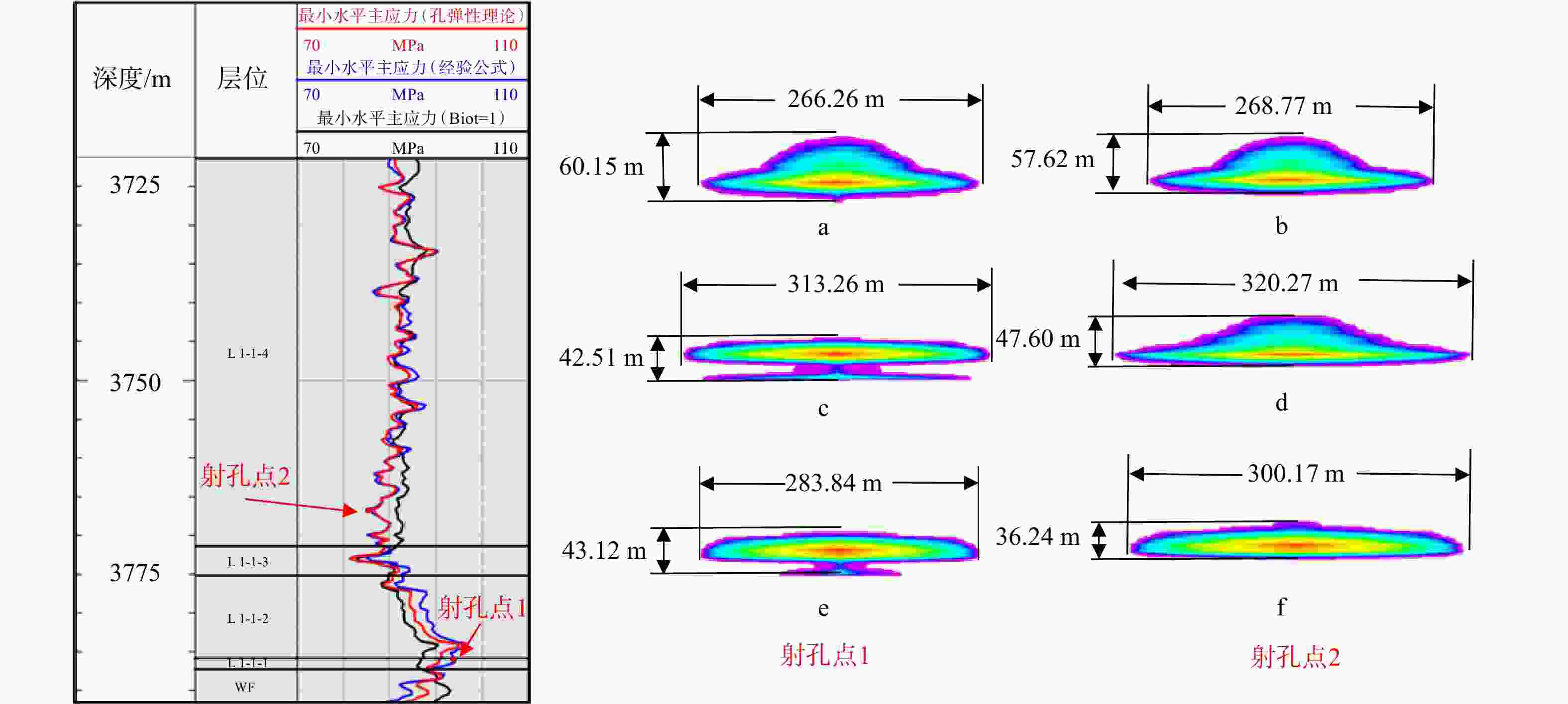 射孔点1测深:3786.5 m,射孔点2测深:3767 mL 1-1-4—龙一段1亚段4小层;L 1-1-3—龙一段1亚段3小层;L 1-1-2—龙一段1亚段2小层;L 1-1-1—龙一段1亚段1小层;WF—五峰组 a—射孔点1,Biot=1条件下裂缝扩展;b—射孔点2,Biot=1条件下裂缝扩展;c—射孔点1,经验公式条件下裂缝扩展;d—射孔点2,经验公式条件下裂缝扩展;e—射孔点1,孔弹性理论条件下裂缝扩展;f—射孔点2,孔弹性理论条件下裂缝扩展