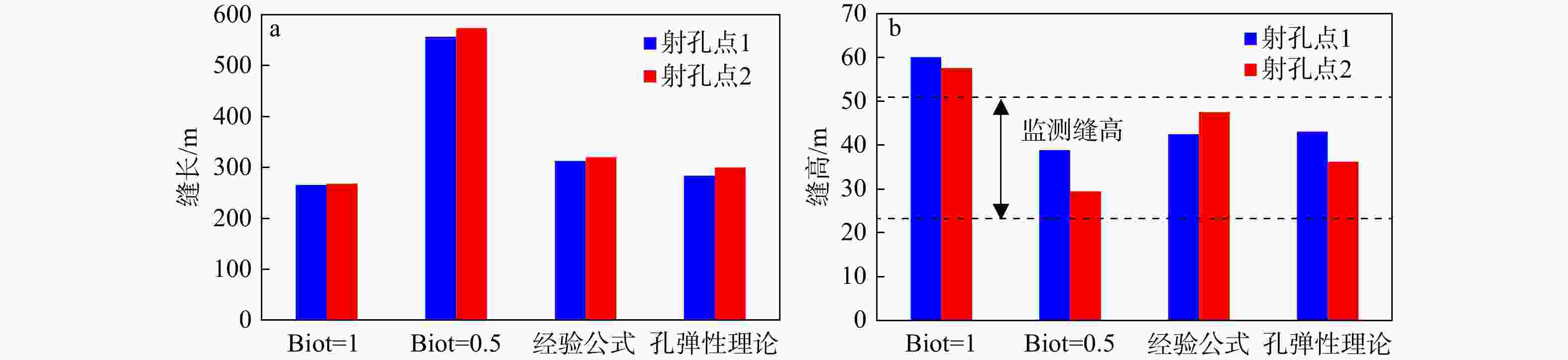 射孔点1测深:3786.5 m,射孔点2测深:3767 ma—不同Biot系数下不同深度位置裂缝缝长;b—不同Biot系数下不同深度位置裂缝缝高
