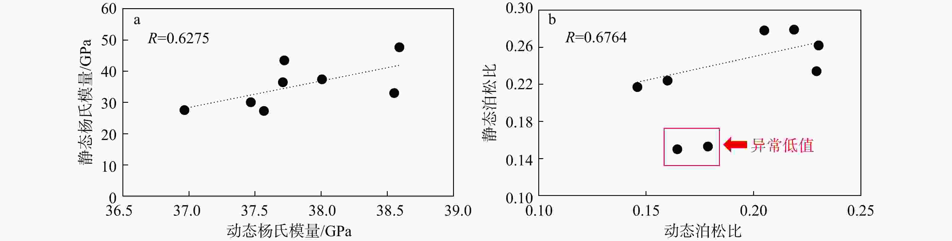a—动、静态杨氏模量转换关系拟合;b—动、静态泊松比转换关系拟合