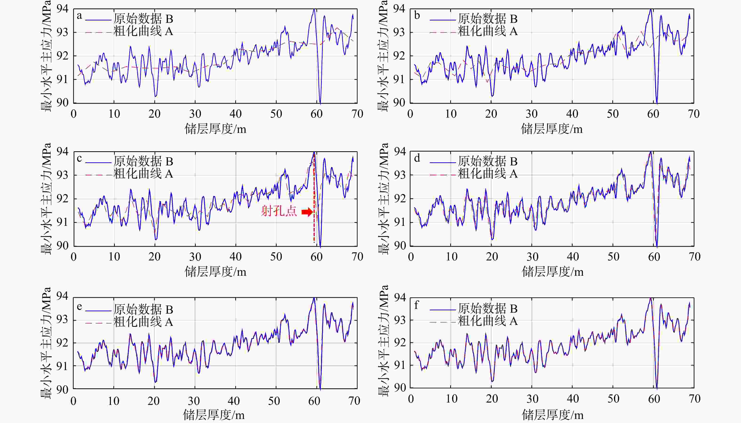 粗化曲线A—不同纵向网格分辨率网格结果;原始数据B—测井数据a—纵向网格分辨率:4.0 m;b—纵向网格分辨率:2.0 m;c—纵向网格分辨率:1.0 m;d—纵向网格分辨率:0.5 m;e—纵向网格分辨率:0.2 m;f—纵向网格分辨率:0.125 m