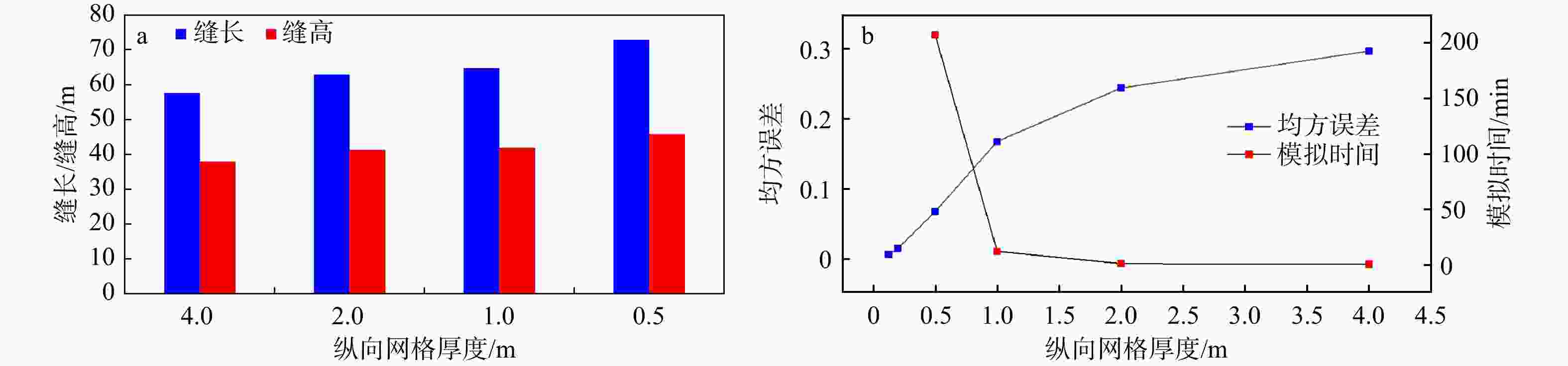 a—不同分辨率裂缝缝长和缝高;b—不同分辨率数据均方误差与模拟时间